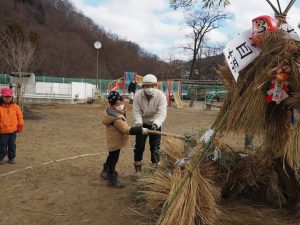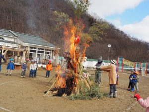勢いよく燃え上がり、だるまや竹の弾ける「ぱ~ん!」という大きい音が次々に聞こえました。子どもたちは驚き、後ずさりしましたが、慣れてくると花火のように聞こえる度に驚いたり、喜んだり、笑ったりしながら、燃えつきていく三九郎の様子を見ていました。