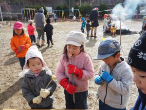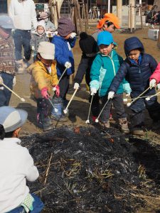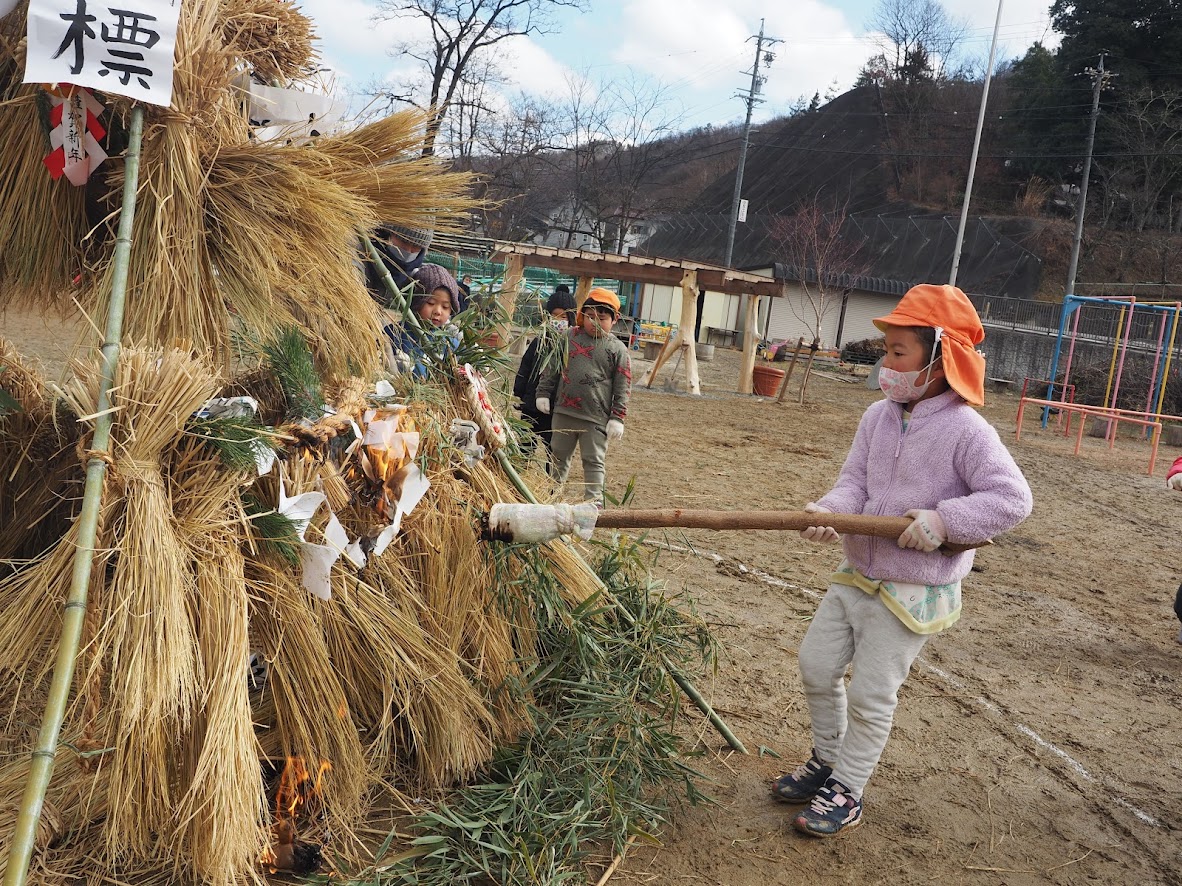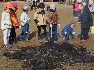 時間はかかるけれど、三九郎の準備から繭玉作りまで子どもたちが考えながら全部行います。そしてくじら雲の年長児しかできない活動も伝統になっています。のこぎり、ナイフといろいろな刃物を使ったり,松明から三九郎に火を移すのも年長児の役目です。危険を子どもたちは認識しています。だからそれに向き合うのも真剣です。
