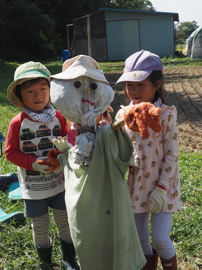 お米が稔るまで、子どもも大人も汗水流して田の草を取り、案山子を作って、お米がたくさん採れるようにと田んぼに置きます。稲が実れば、案山子のおかげと、秋には十日夜を行い案山子を森に返すお祭りもしてきました。お祝いにお餅をついて皆で食します。