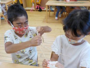 2人で力一杯引っ張ると千切れてしまうし、でも力を入れないと取れないし、、、と自分たちで工夫する子どもたち。