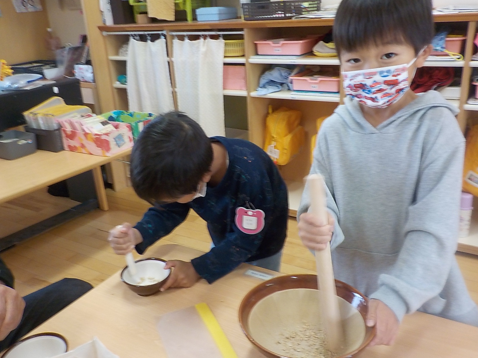 籾摺りでは、一杯お米を摺ると粒が潰れてしまい、「お米がなくなるー!」と言って力加減を工夫していました。