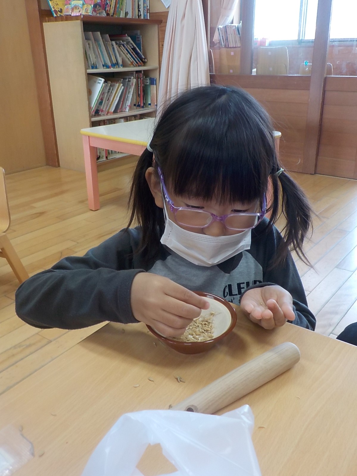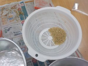 次は、すり鉢とボールを使って籾摺り(もみすり)に挑戦!