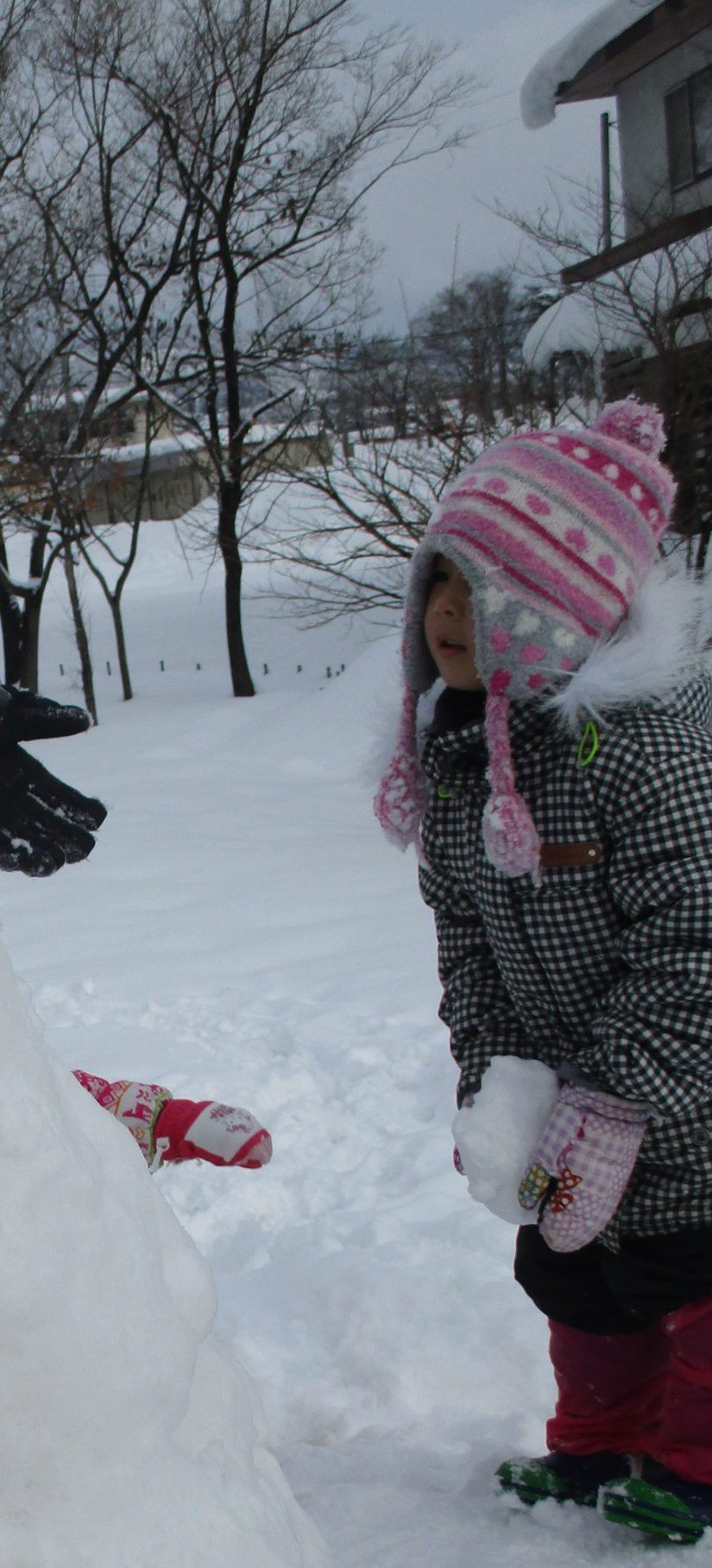 手のひらいっぱいに新雪をすくいあげてくる子や、丸めて玉にしてくる子。高くしたいという強い思いから、雪がどんどん集まります。