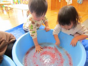 一歳児クラスでは、水の中に紙テープを入れ少し違った感触や見た目を楽しみました。