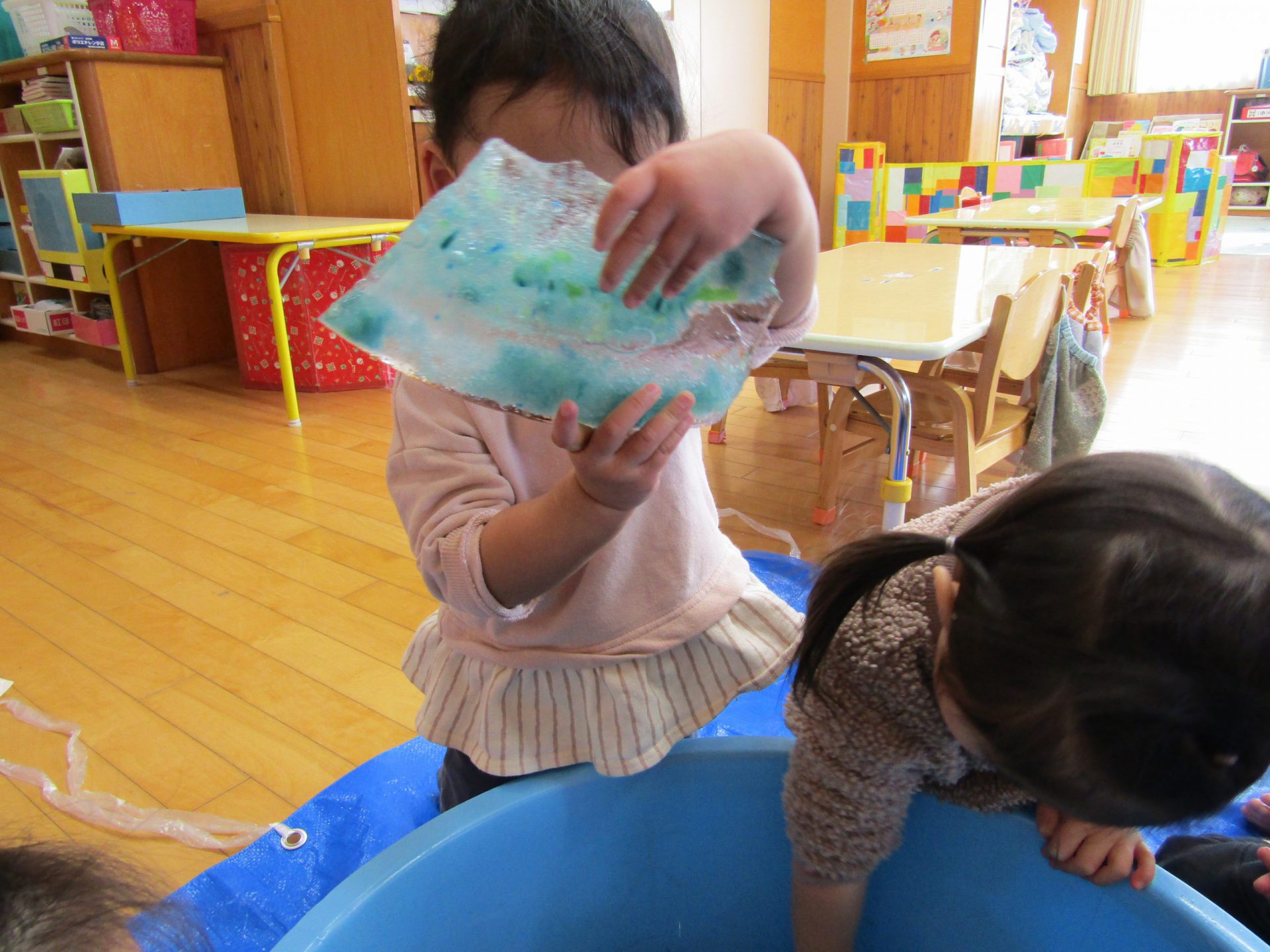室内で氷遊びをしていると、室温で溶けた氷を見て「え!なんでお水になっているの?」と不思議さを感じ、手で氷を持っていると体温で溶けてしまうことに気が付き、「なくなっちゃう!」と戸惑いながらも氷遊びを楽しむ姿が見られました。