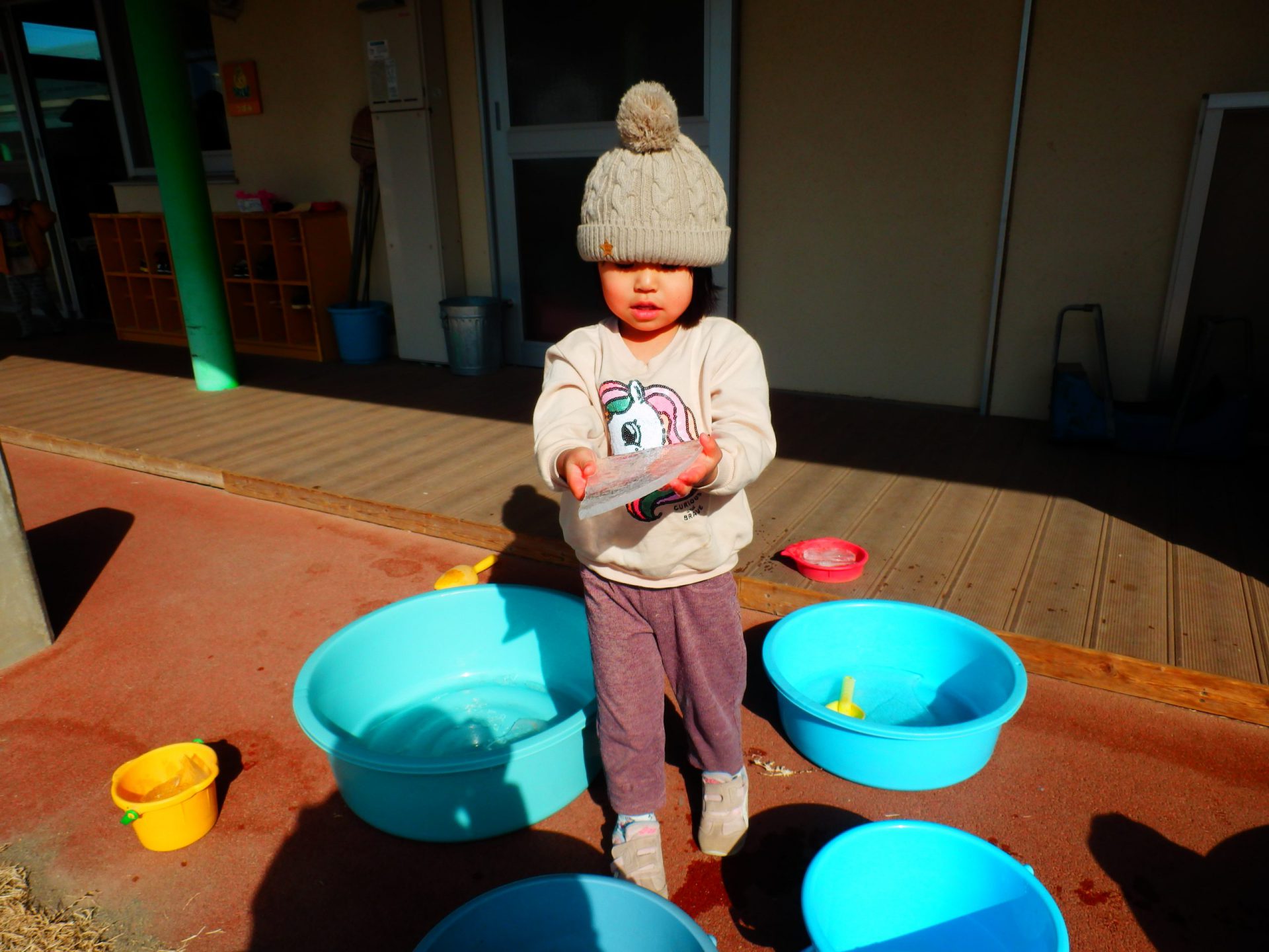 ある寒い日、砂場へ遊びに出るとバケツにたまった雪が溶け、氷になっているのを見つけた子どもたち。「もっと氷遊びがしたい!」ということで、タライやカップに水を入れそれぞれのクラスで氷づくりをし、氷遊びを楽しみました。