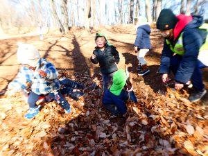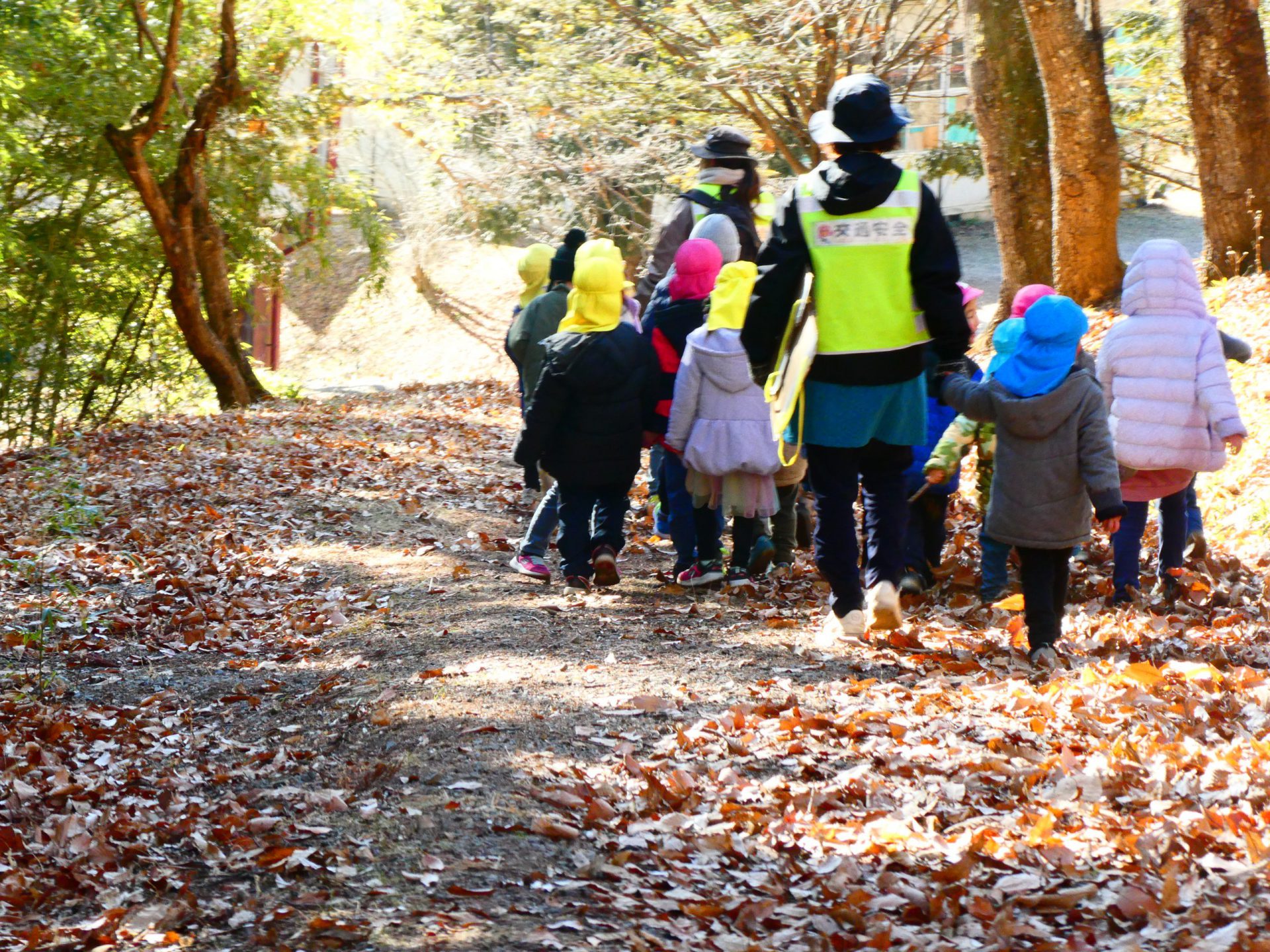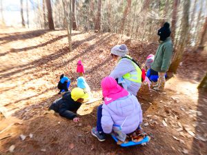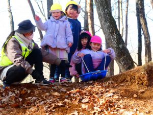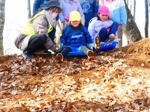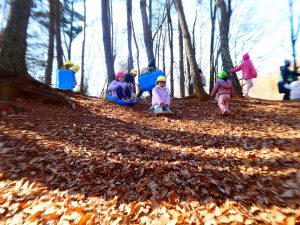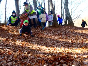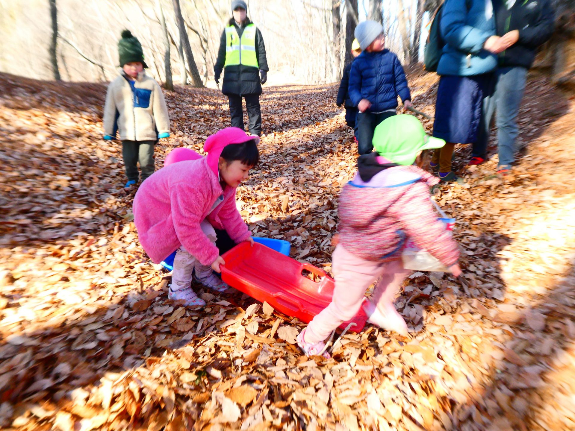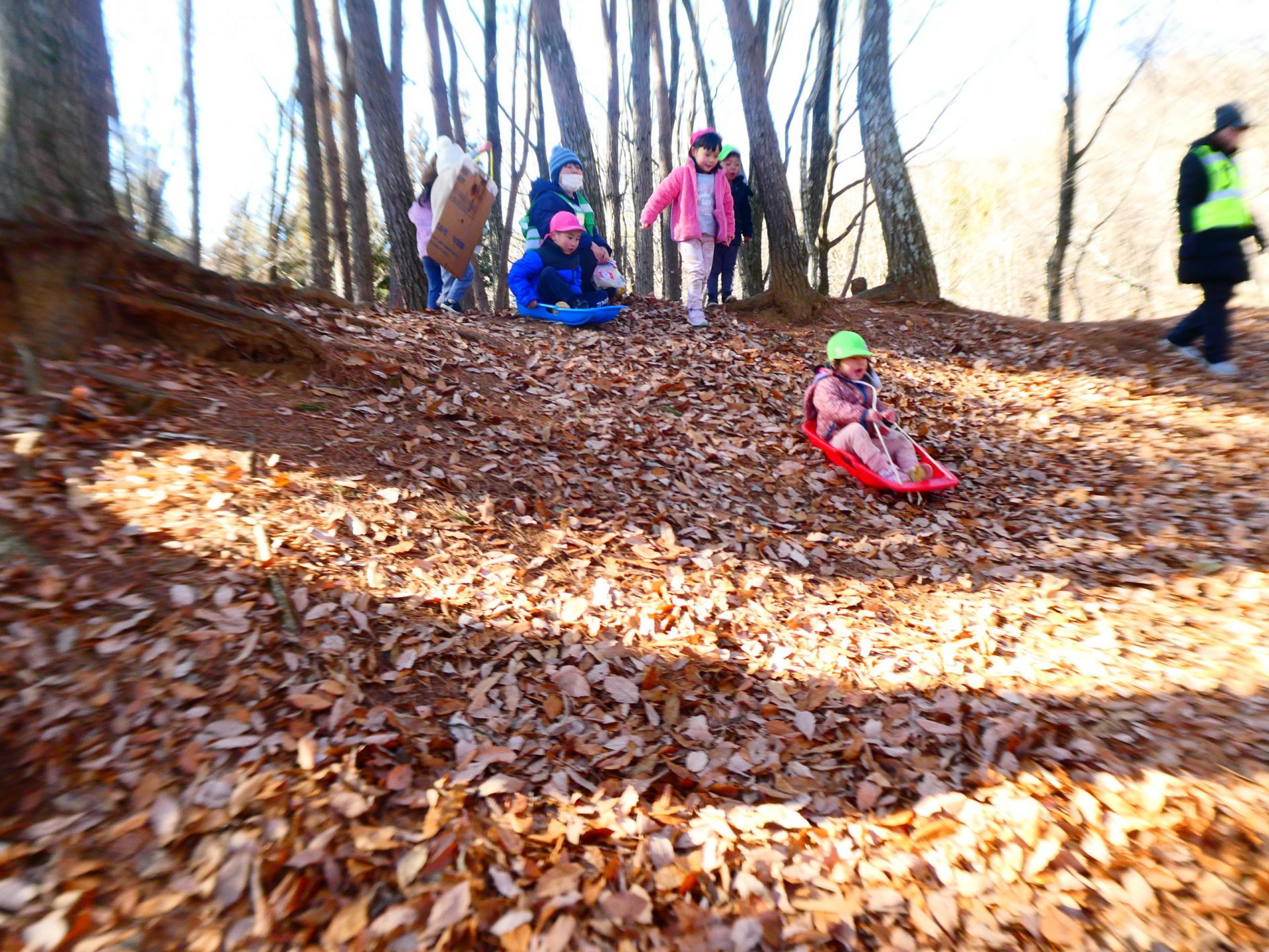 ・裏山は落ち葉が沢山あり、そりすべりをのびのびと楽しめた。雪より落ち葉の方が怖くないのか、普段やろうとしない子や2歳児も挑戦していた。