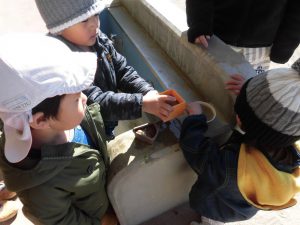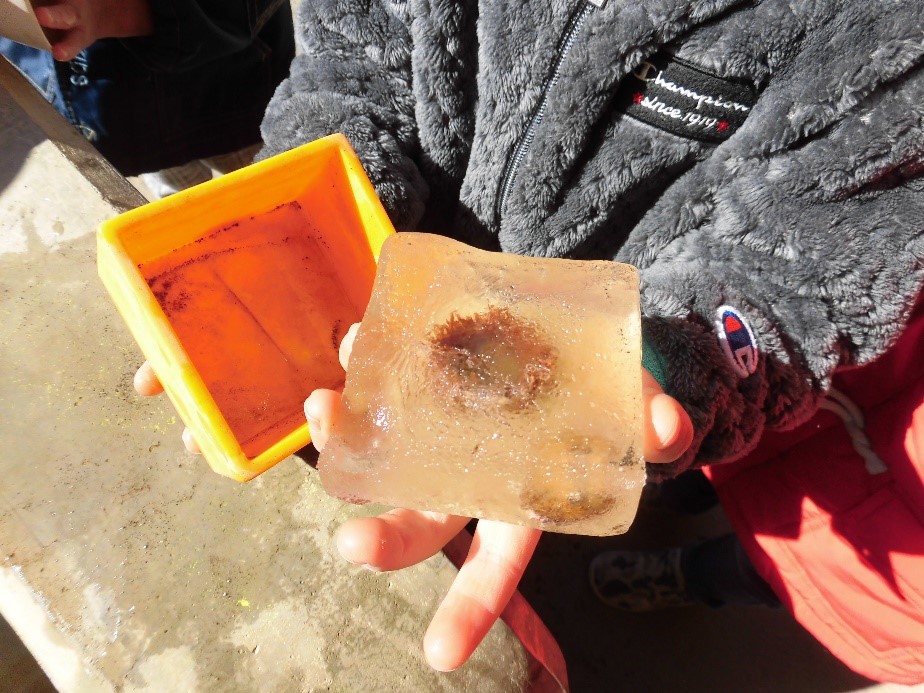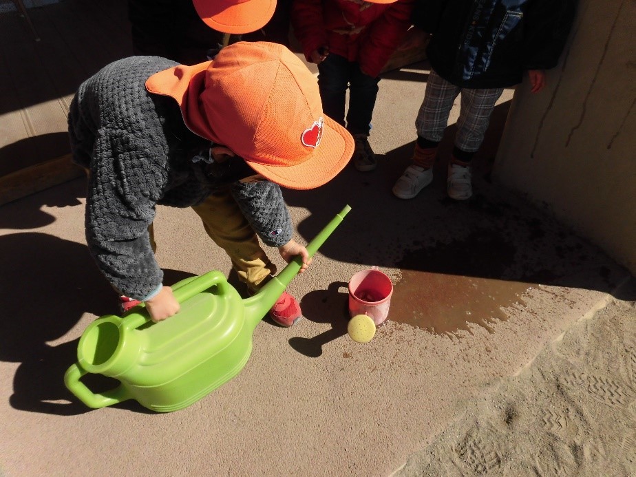 水を入れながら「どうなるかな?」「寒いところに置いたほうがいいよ」と、想像したり考えている様子が見られ、冬の自然へ興味をもっている姿が見られた。