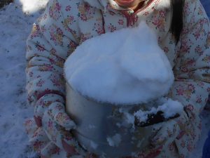 園庭に行くとすぐに「見て。雪いっぱい取れた」と集めて遊び始めました。