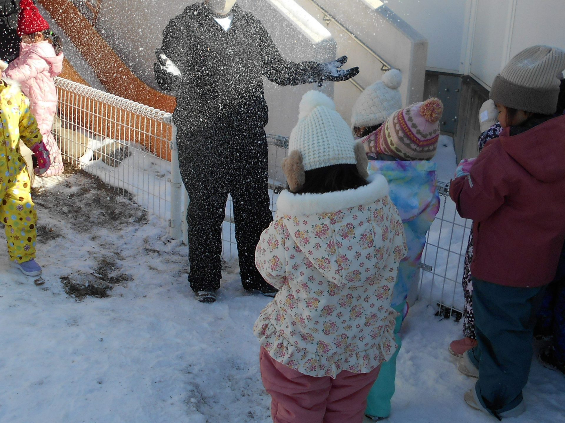「雪遊び大好き」「もっと雪降るかな?」と雪遊びを楽しむこどもたちです。