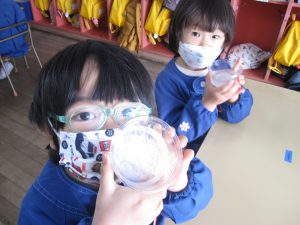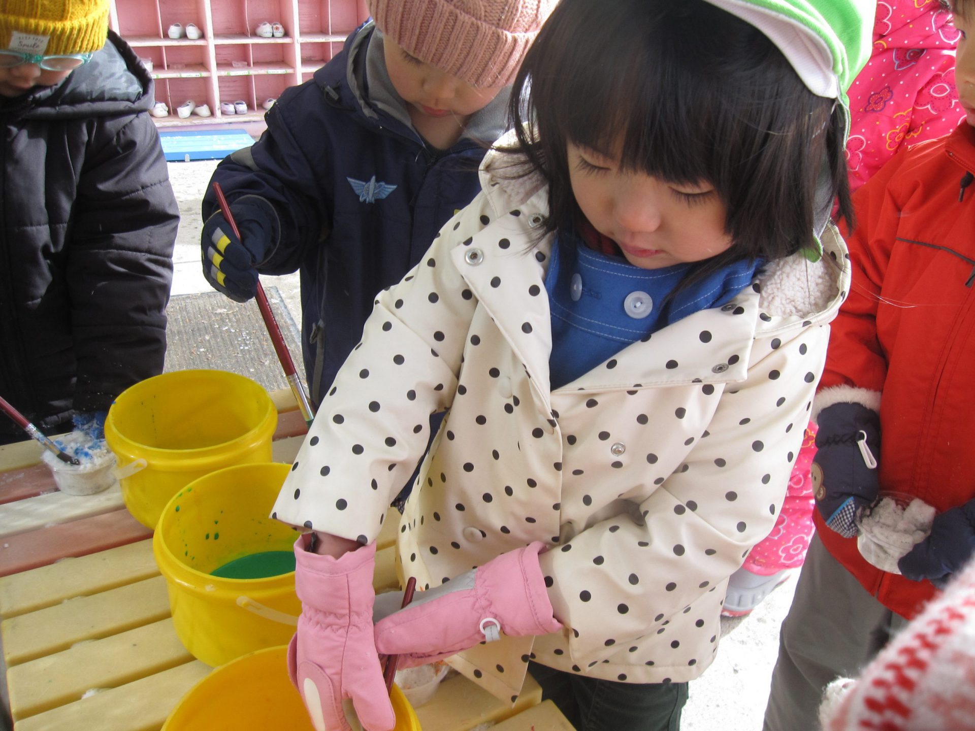 待ち望んでいた雪に大興奮でした。雪玉を作ったり、氷の観察をしたりと自分の好きな遊びを楽しむ中で、かき氷屋さんをしようというアイデアが子ども達から出てきました。絵の具のシロップを思いついたり、葉っぱで飾りつけをしてみたりと、子ども達が「やってみたい」と考え、それをやってみようとする姿をこれからも大事にしていきたいと思います。