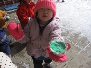 雪玉を作って遊んでいた子ども達「これかき氷みたいだね」「かき氷屋さんしようよ」「絵の具で色をつけたらいいんじゃない?」