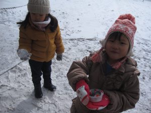 先日園庭に雪が積もりました。雪遊びを楽しみにしていた子ども達は登園してから「早く外に行こう!」とわくわくです。