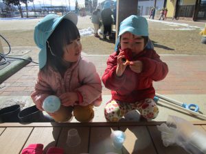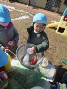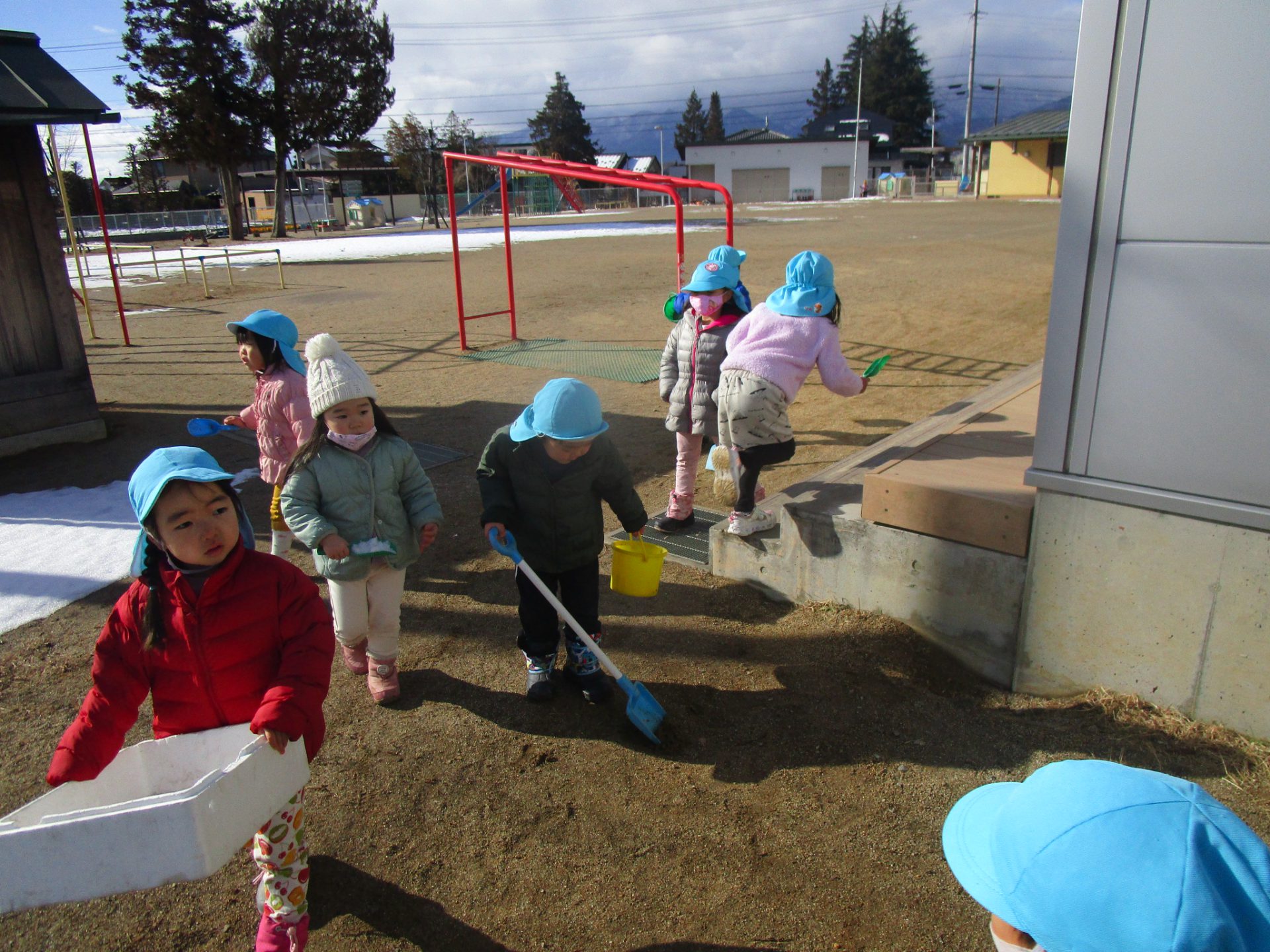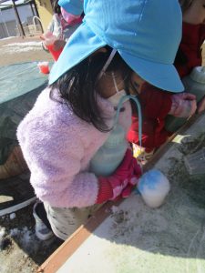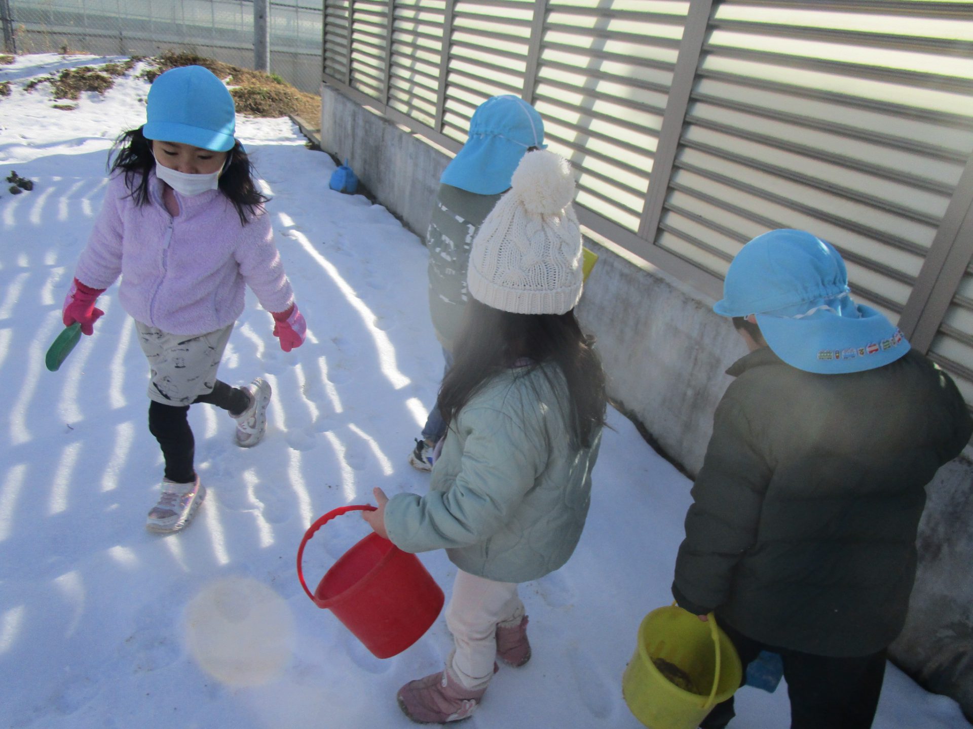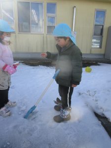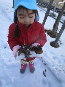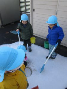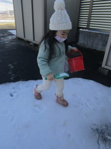 今まで雪であそんだ経験から “寒いから手袋がいるな” “スコップだといっぱい掘れる” ”バケツだといっぱい雪が入るぞ”など自分で必要なものを準備しあそぶようになってきました。