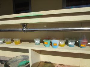 「色水出てこないなぁ・・・お腹でおしてみよう」