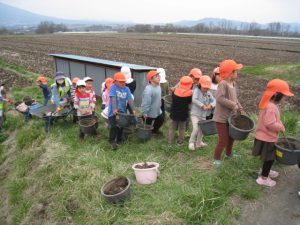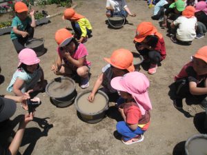 春には近くの田んぼから土をいただき、代かきをしました。「うわ~気持ちいい!」「冷たい!!」土から泥にかわる感触を味わいながら一生懸命かきまぜました。
