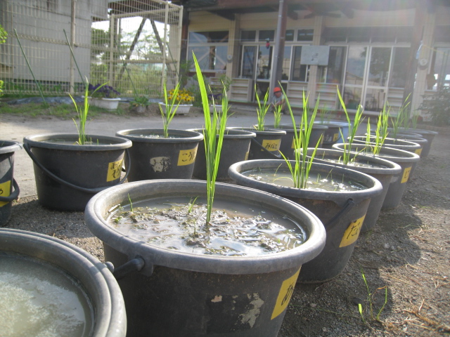 毎年恒例のバケツ田んぼを、今年も年長さんが体験しました!