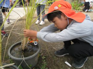 子どもたちも、バケツにおたまじゃくしを発見したり、稲に穂がついたことに気づいたりしながら、大切に育ててきました。いよいよ収穫です!