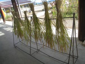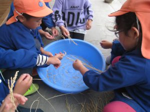 その後、子ども達の手で脱穀をし、すり鉢を使ってもみすりをしました。