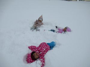 たくさんの雪に大興奮の子どもたち、雪をかきわけ歩き、全身で雪遊びを楽しんでいます。