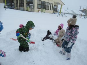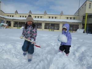 待ちに待った雪遊び、友達と声を掛け合いながら楽しんでいます。雪の中を歩くことや、雪山を歩くことも体力がいりますね、今しかできない雪遊びたくさんの経験ができたらと思います。