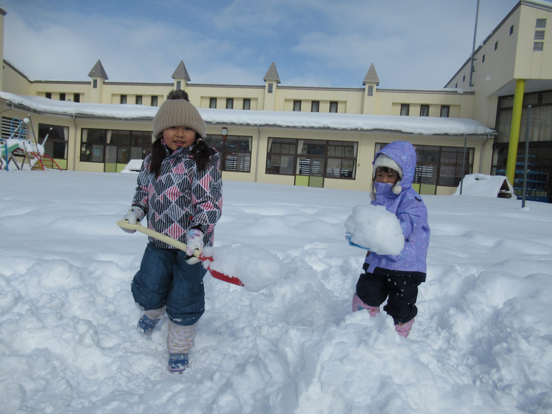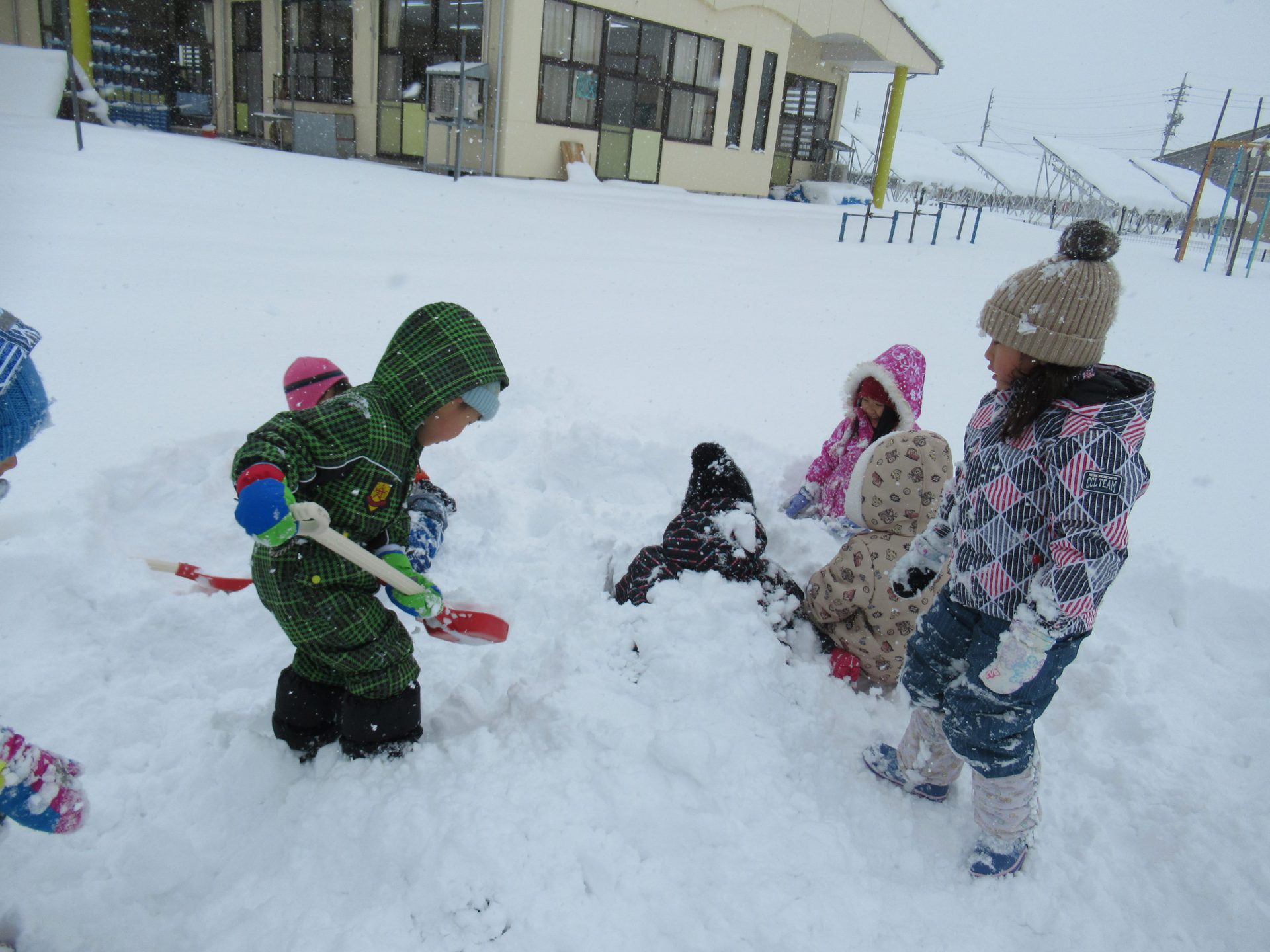 「かまくら作ろう」「ここから雪持ってくね」「ここに穴をあけようよ」と声を掛け合いながら雪を運ぶ子、雪を固める子、と協力して楽しむ姿がありました。