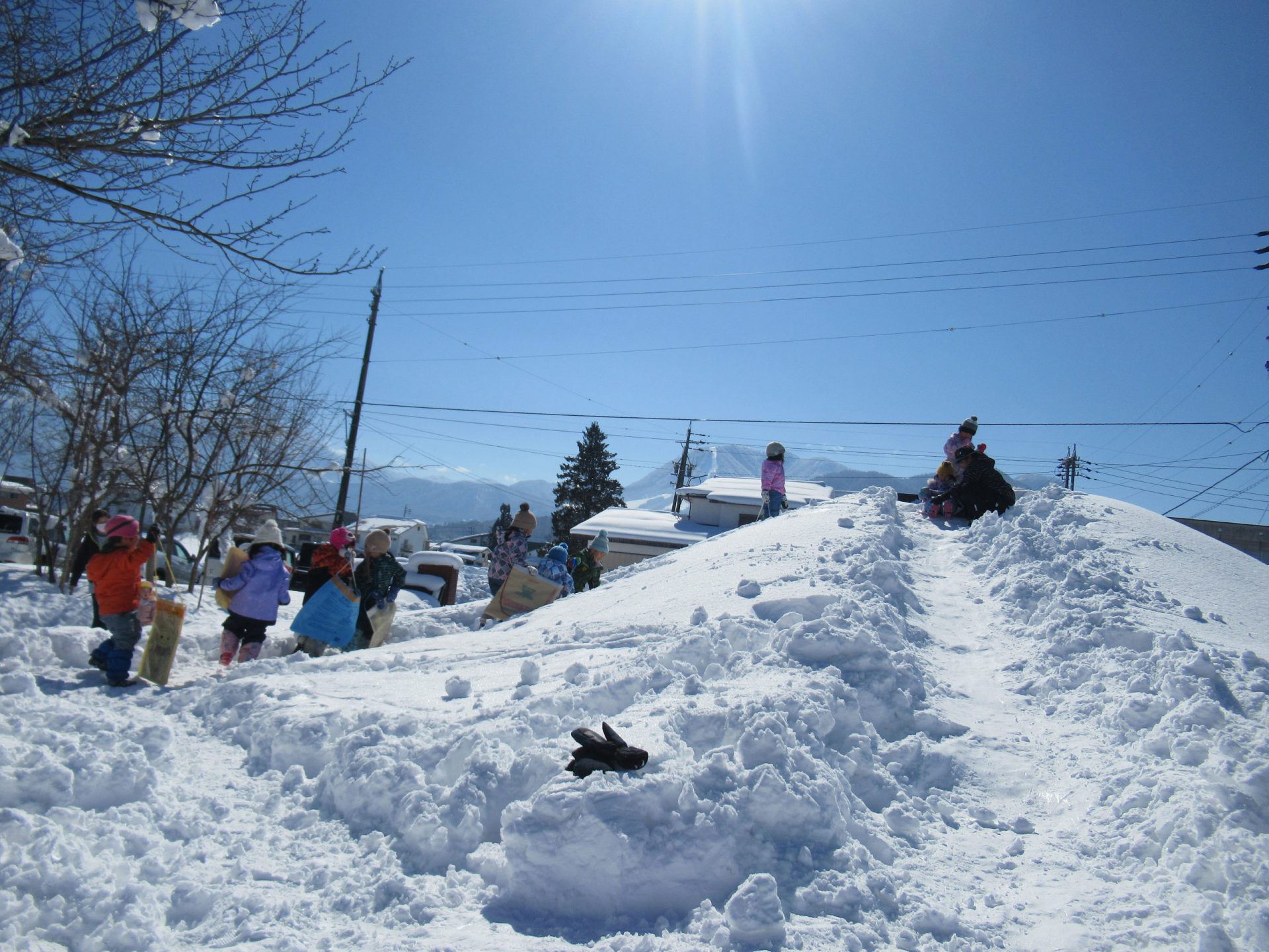 「足をこう上げると早く滑れるんだよ」と滑り方も考え自分なりに変えてみたり、寝転んでボブスレーのように滑ってみたりと、友達の真似をし滑り、ゆきぐみさんはそりのプロです(^^)