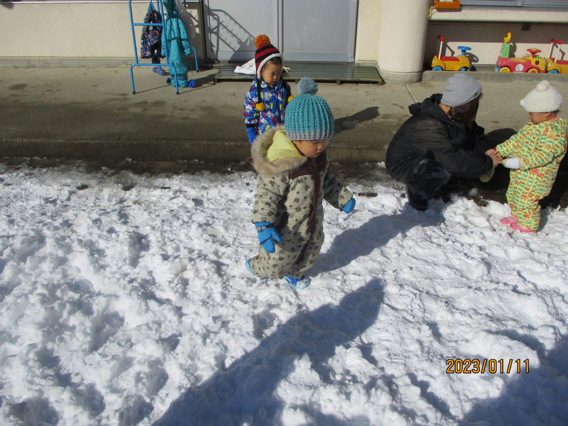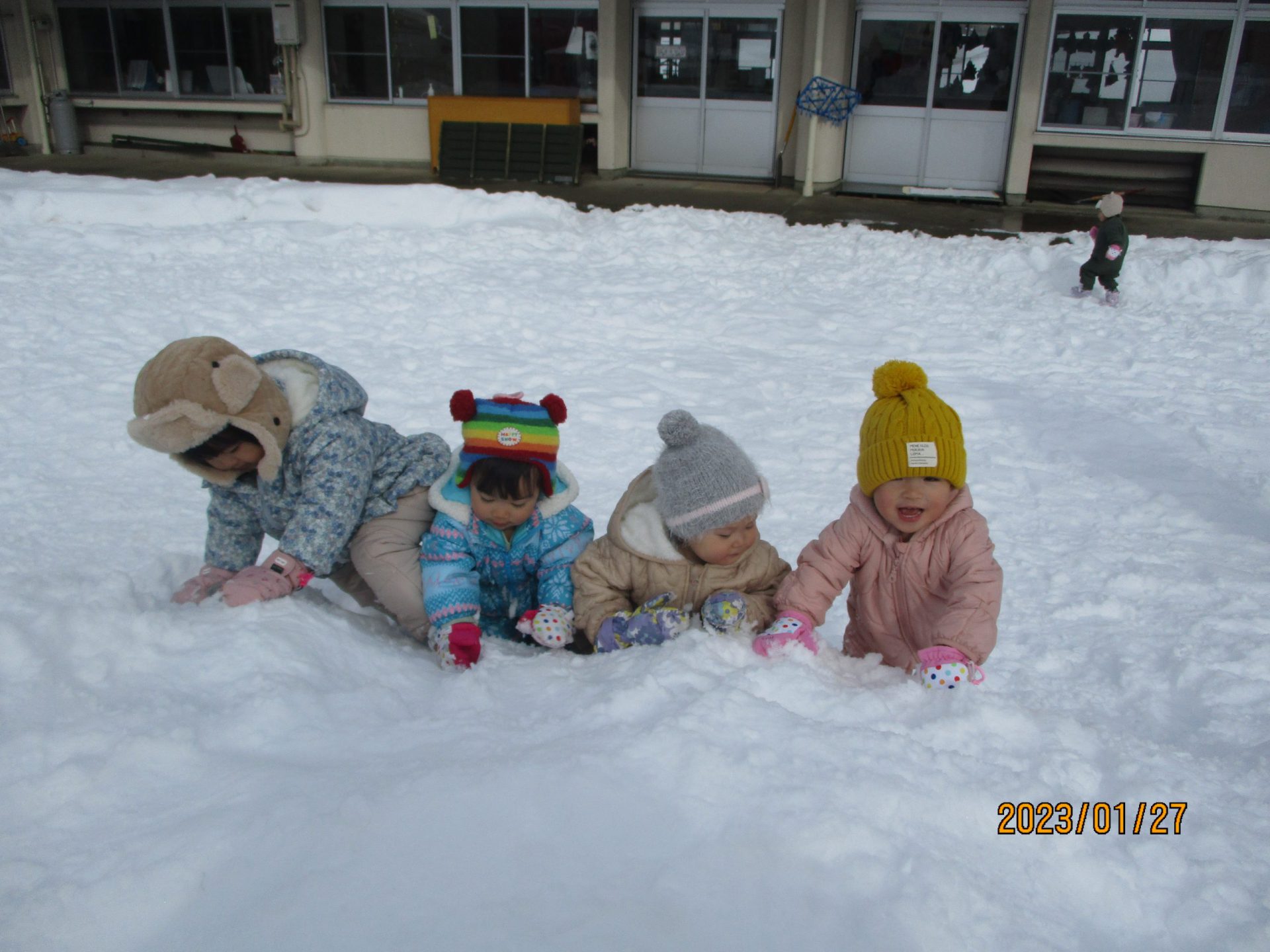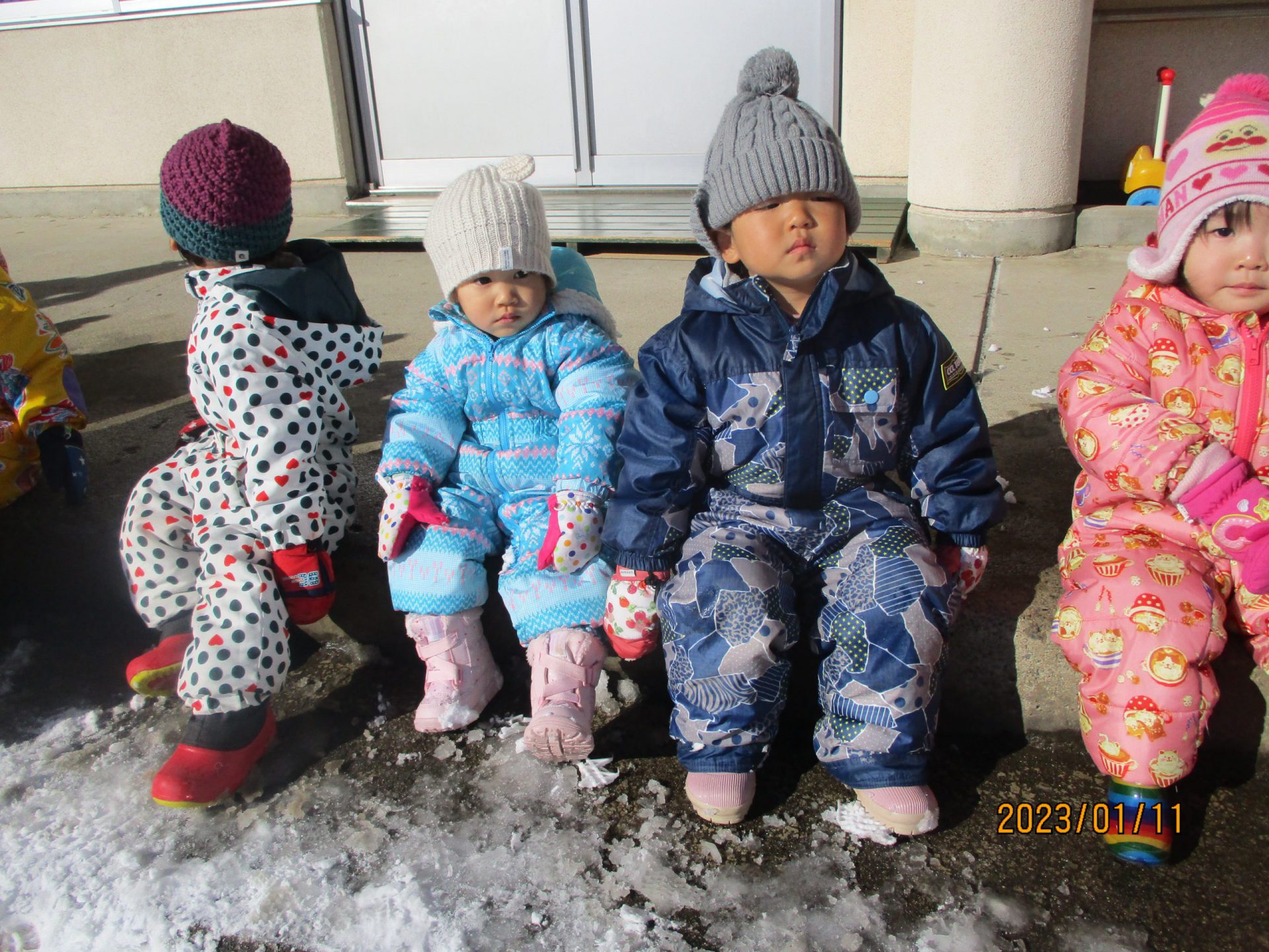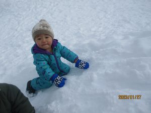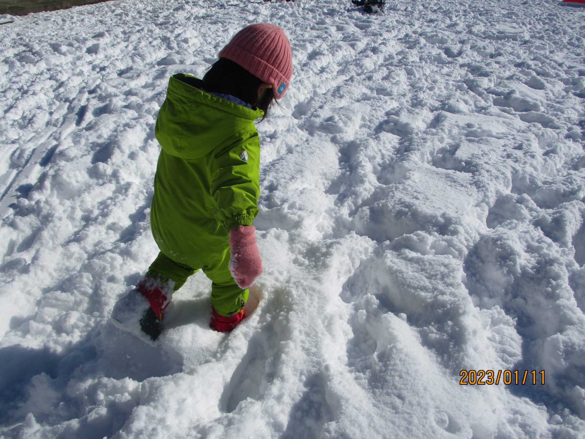 今年度はの信濃町は雪が思うように積もらずなかなか園庭に出ることができませんでしたが、年明けに雪が降りついに雪遊びデビューできました!