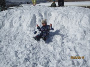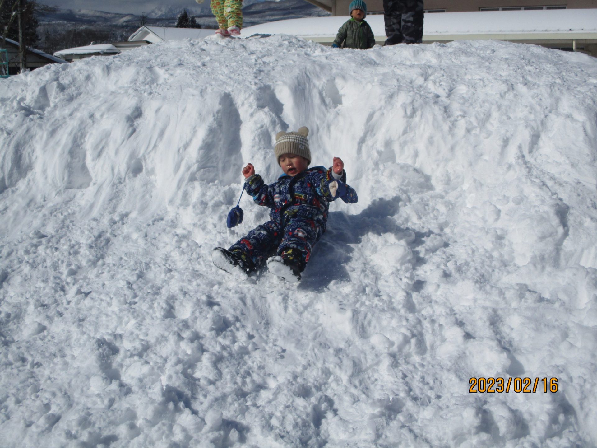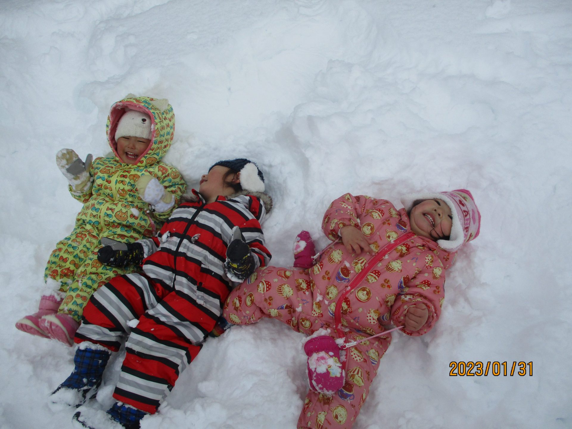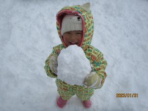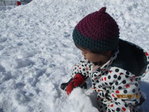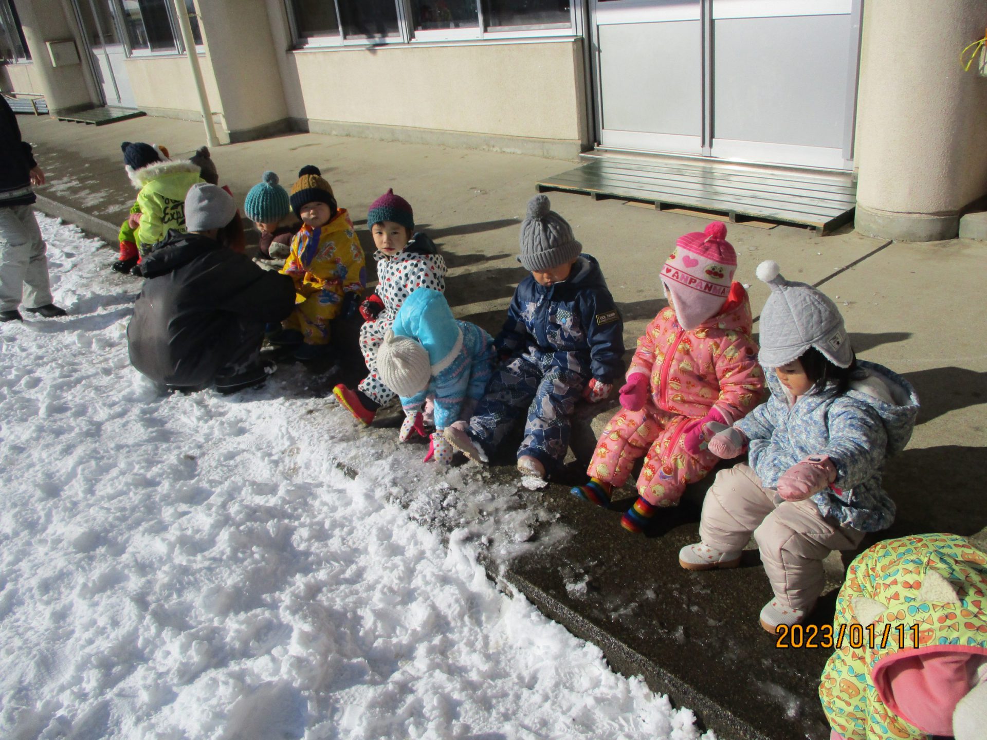 今年度はの信濃町は雪が思うように積もらずなかなか園庭に出ることができませんでしたが、年明けに雪が降りついに雪遊びデビューできました!