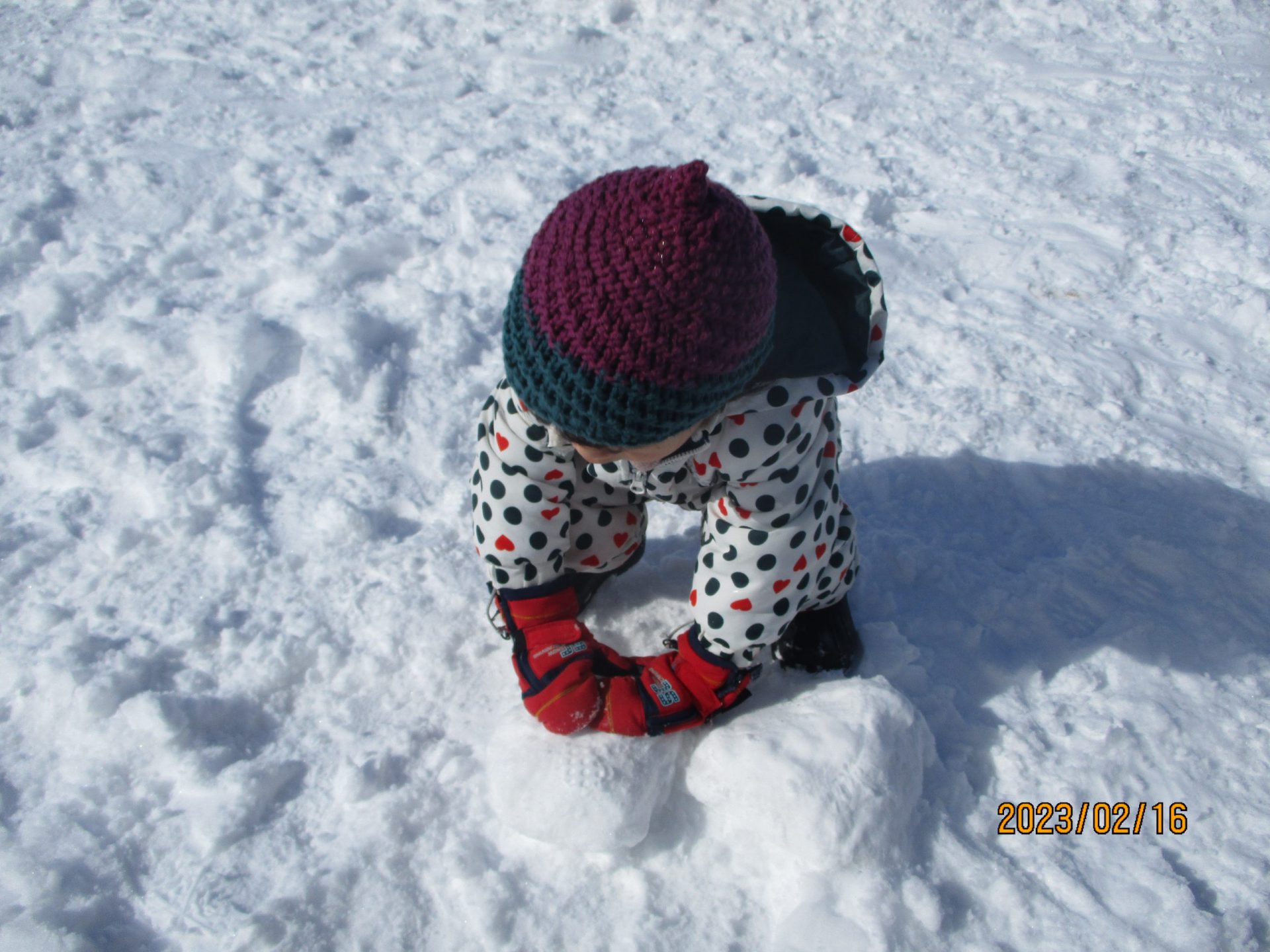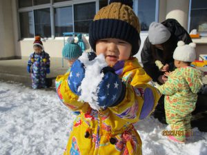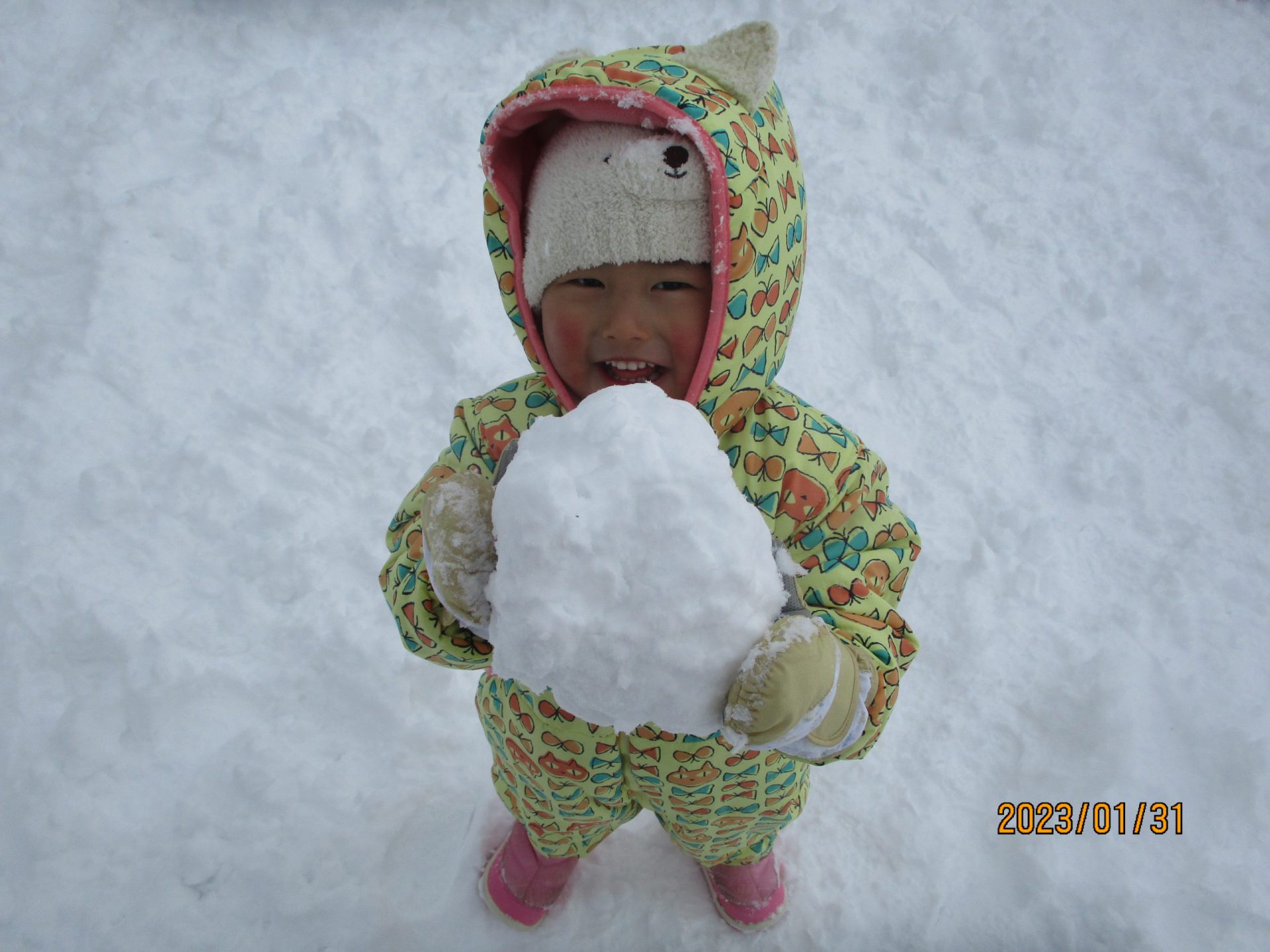 「先生見てー!おっきいよ!」と自分の顔と同じくらいの大きさの雪玉を見つけて持ってきてくれました。