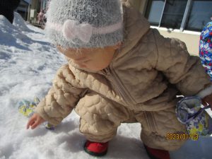 手袋を外して“そぉ~”と触って、雪の感触や冷たさを感じている子も。ひんやりして気持ちいいね。