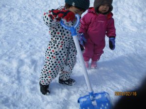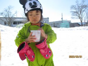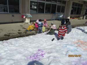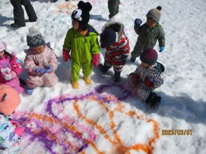 日に日に積雪が増えてきた園庭。その日の天気によって変わってふわふわだったり固まりやすかったりする雪は子ども達に思わぬ発見をもたらす遊びのひとつです。子ども達が自ら触れたり、関わったり、その変化や感触を楽しめるような環境を用意していこうと思います。