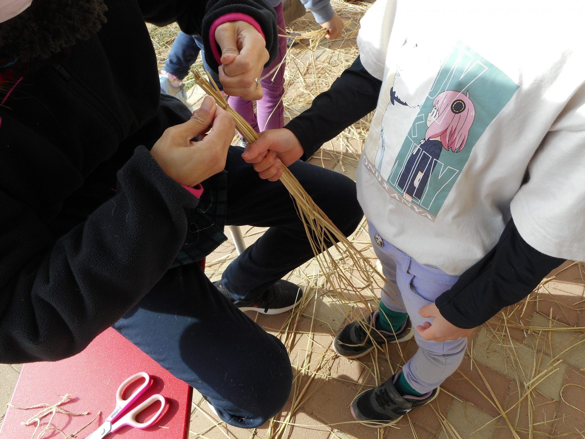 『湿らすと束ねやすい』というのは、しめ縄飾りを作るときのコツです。知っていた保育士に教えてもらい、「本当だ!」と言いながら三つ編みに取り組んだ子どもたちでした。