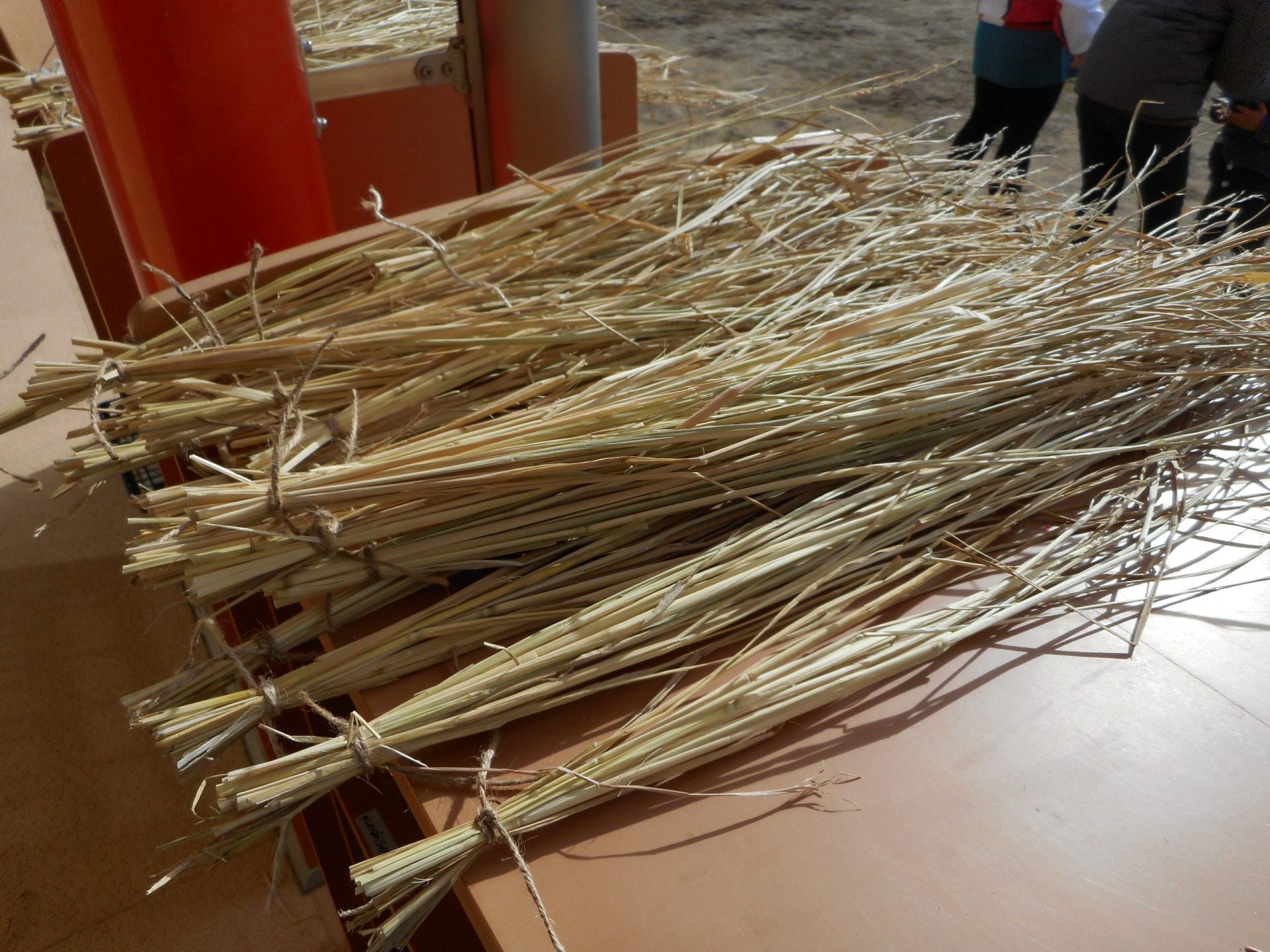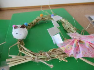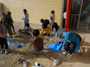 わらは、園ではもちつきの臼の下に敷いたり、さつまいものおふとんに敷いたり、畑の肥料になったりと様々な場面で活躍しています。そのわらを使っての制作は子どもたちにとって身近なものを使っての楽しみになりました。