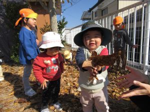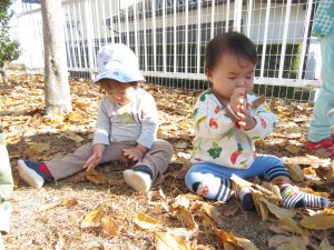 言葉で何かを伝えることはまだ難しい年齢ですが、子どもたちの表情や一つ一つのしぐさからこの落ち葉遊びをその子なりにじっくり楽しめた満足感が伝わりました。出会う自然のすべてが新鮮な刺激となる乳幼児期の子どもたち。五感を使って自然を感じることができるような体験をこれからもたくさんさせてあげたいと思います。