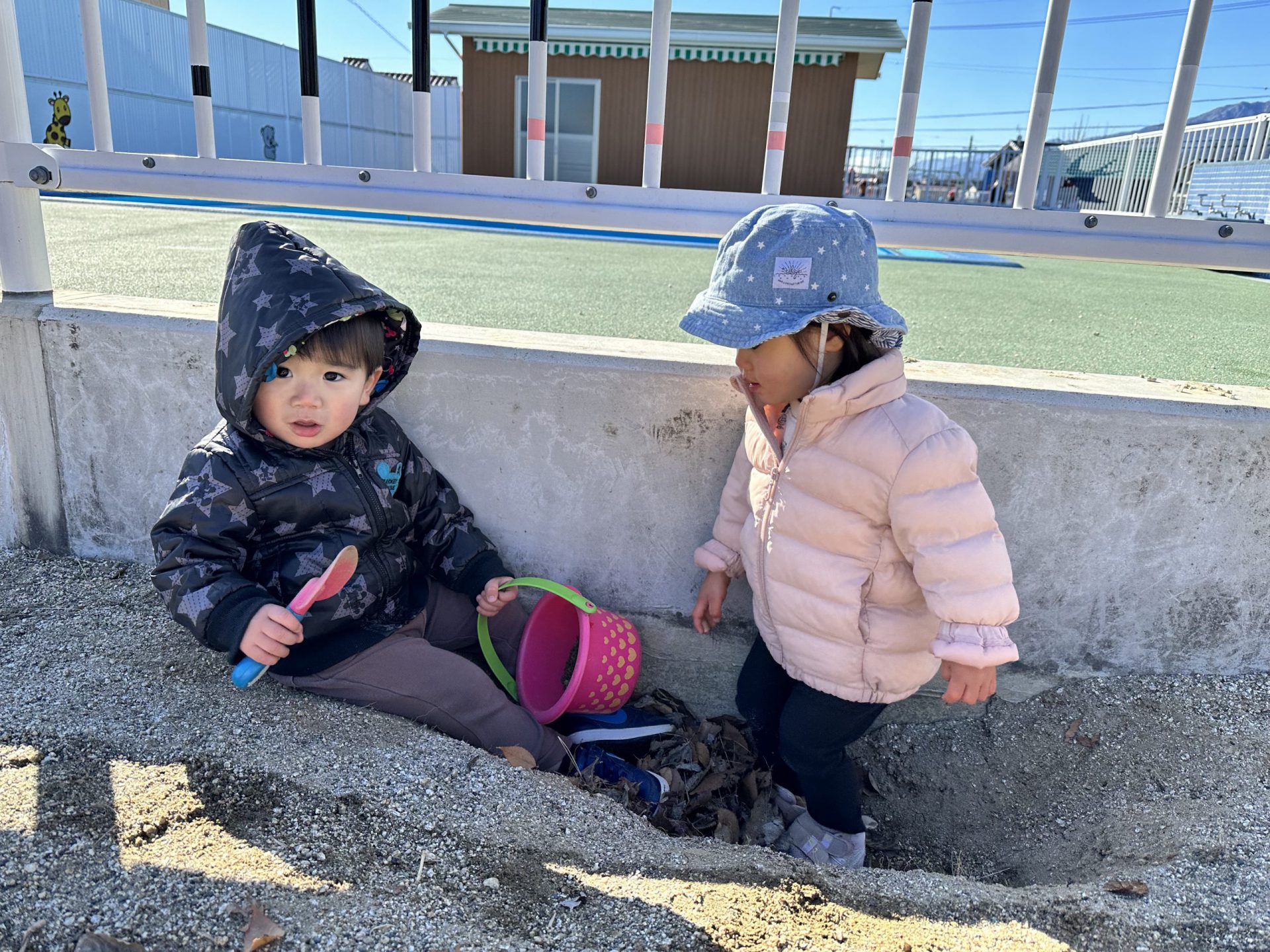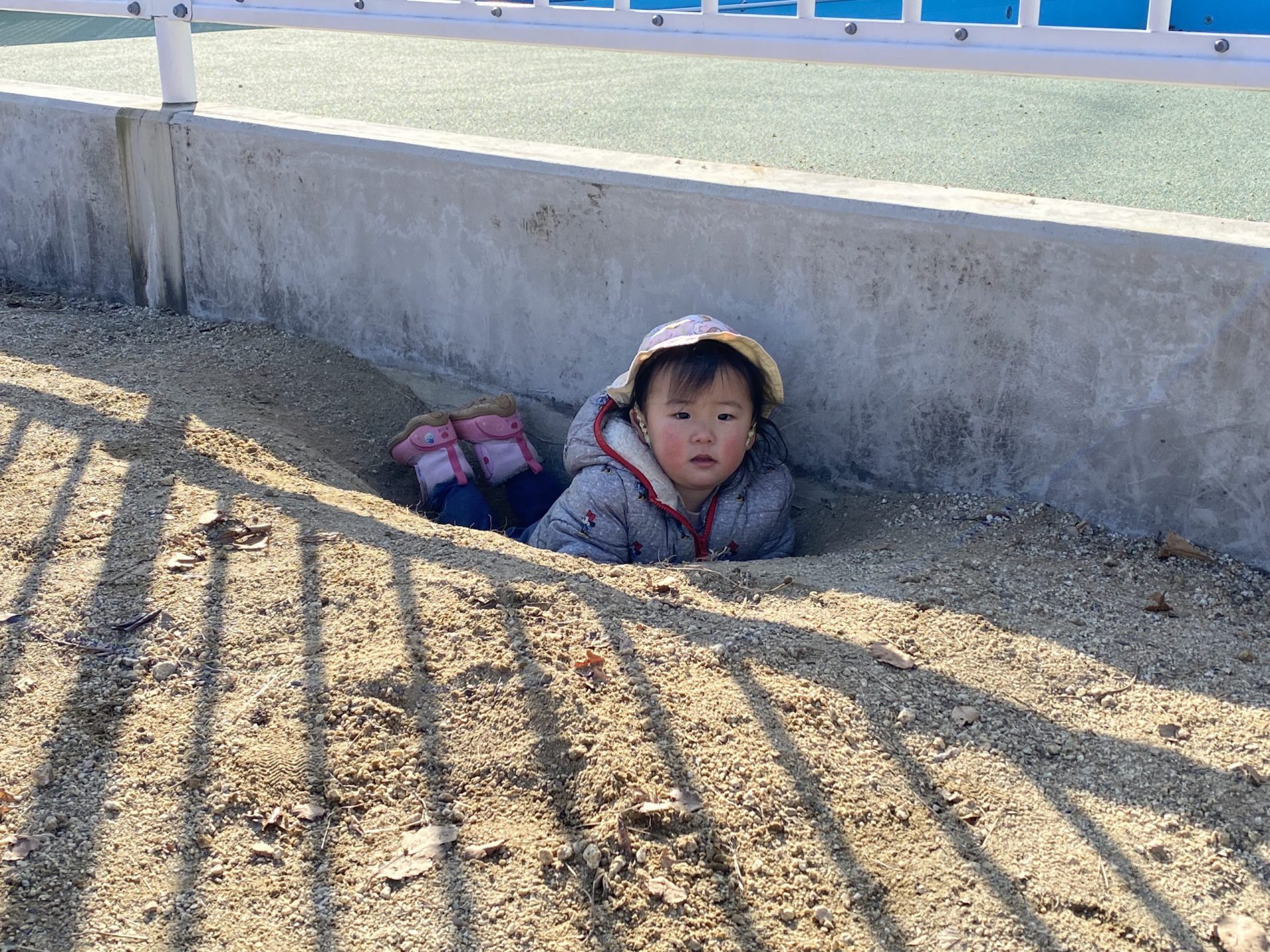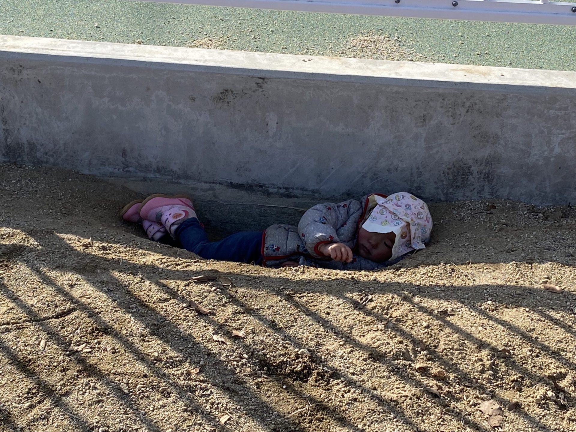 ・戸外遊びをしている中で2歳児が掘った大きな穴を見つけて興味を持つ。