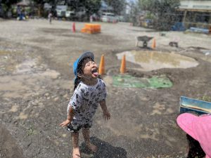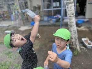 昨年度もウォーターフェスを楽しんでいたので、子ども達も待ってましたと言わんばかりに外へ駆け出し、水鉄砲やホースを使って水を掛け合っていました。水鉄砲が足りなくなると、「次貸して」「順番に使おうよ」などの貸し借りができていたり、お友達や保育士から水をかけてもらって「つめたーい!」「逃げろー」と楽しんだりする姿がありました。また、頭から水を浴びて楽しむ姿からは、ビショビショに濡れることを気にせずに思いっきり水遊びを楽しんでいるように感じました。