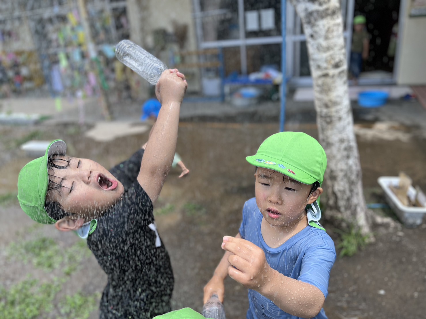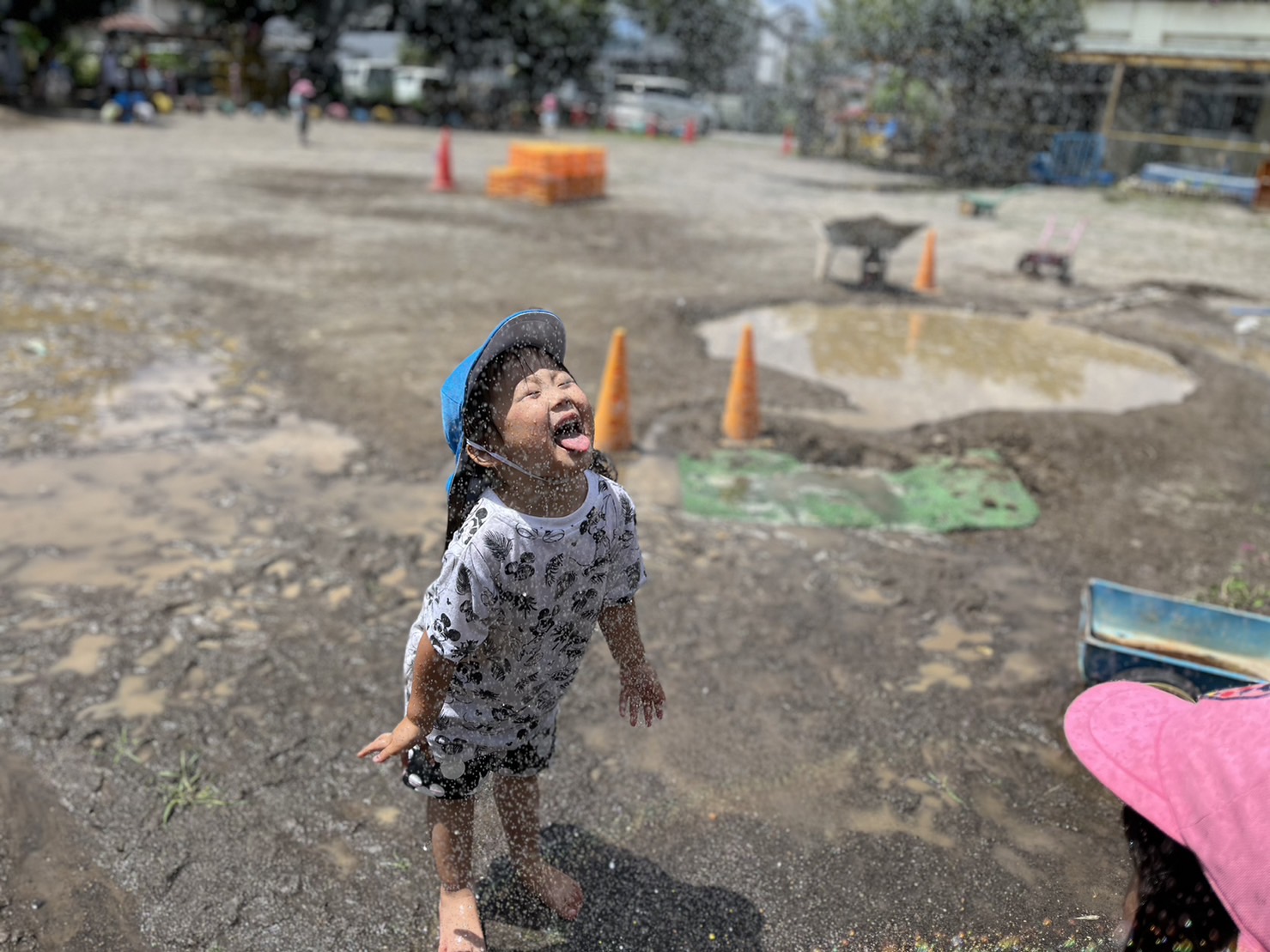 園庭を広く使ってダイナミックに水遊びを楽しんでいた子ども達。