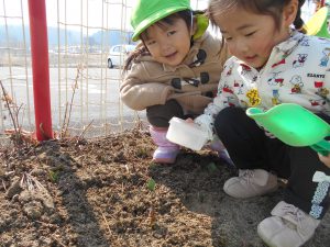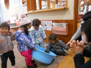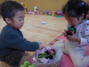 ここ飯綱町もあったかくなってきました。2月、3月は季節の変わり目・・風邪をひく子も多く中で遊ぶことが多くなってしまいました。その中でも、春の訪れを感じてほしいな・・と思っていた保育士。窓辺に置いてあったお花が咲いたことに気付き、子ども達に見せると、「わあー」と集まり、「春だね」と保育士が言うと静かに、花びらを触ったり、匂いを嗅いだり、外からの鳥の声にも気づき、子ども達と身近に春を感じることができ、嬉しく思いました。子ども達の思い、感動を言葉にして、伝え合い共感することを大切にゆっくり保育をしていこうと思いました。