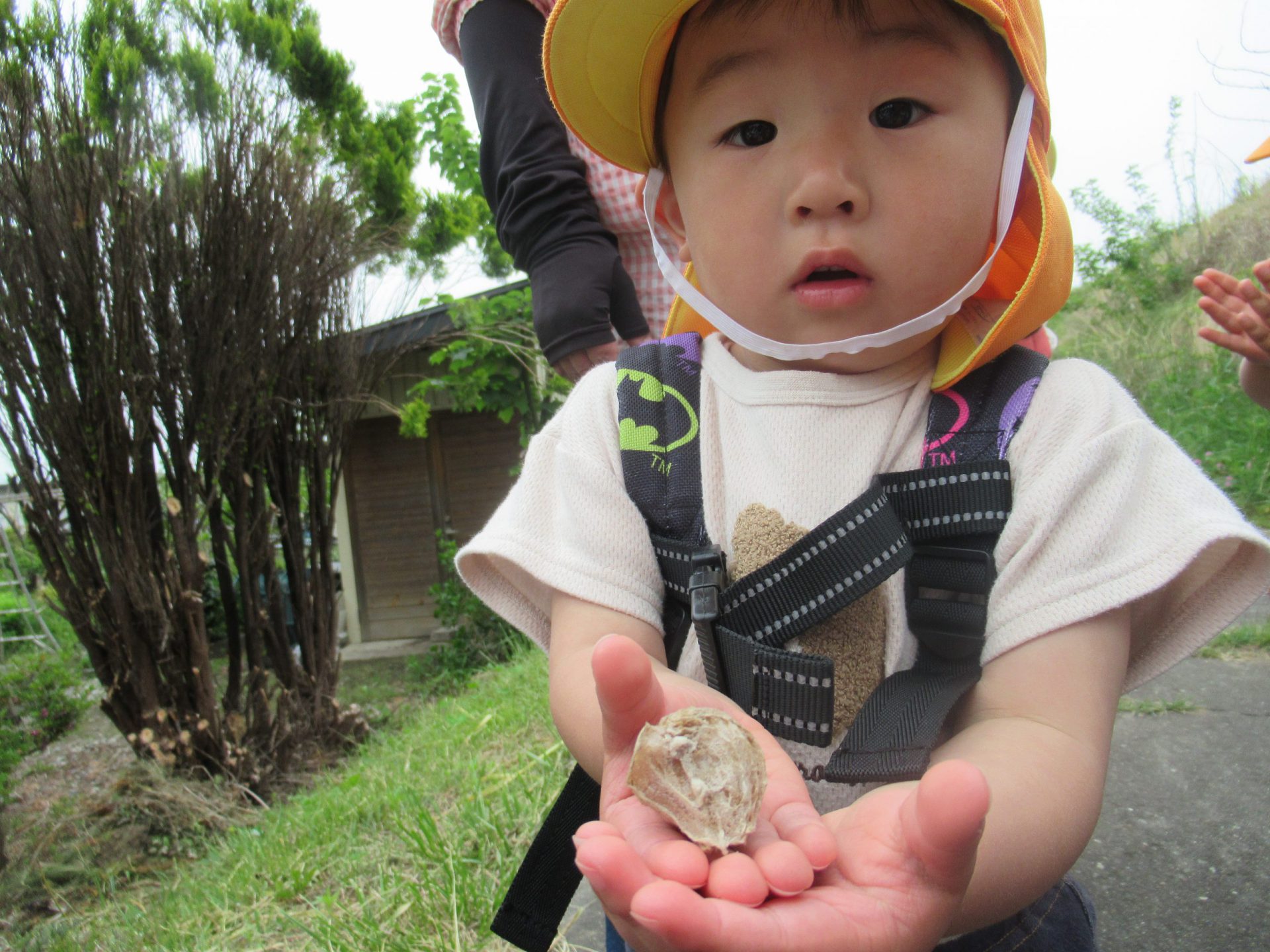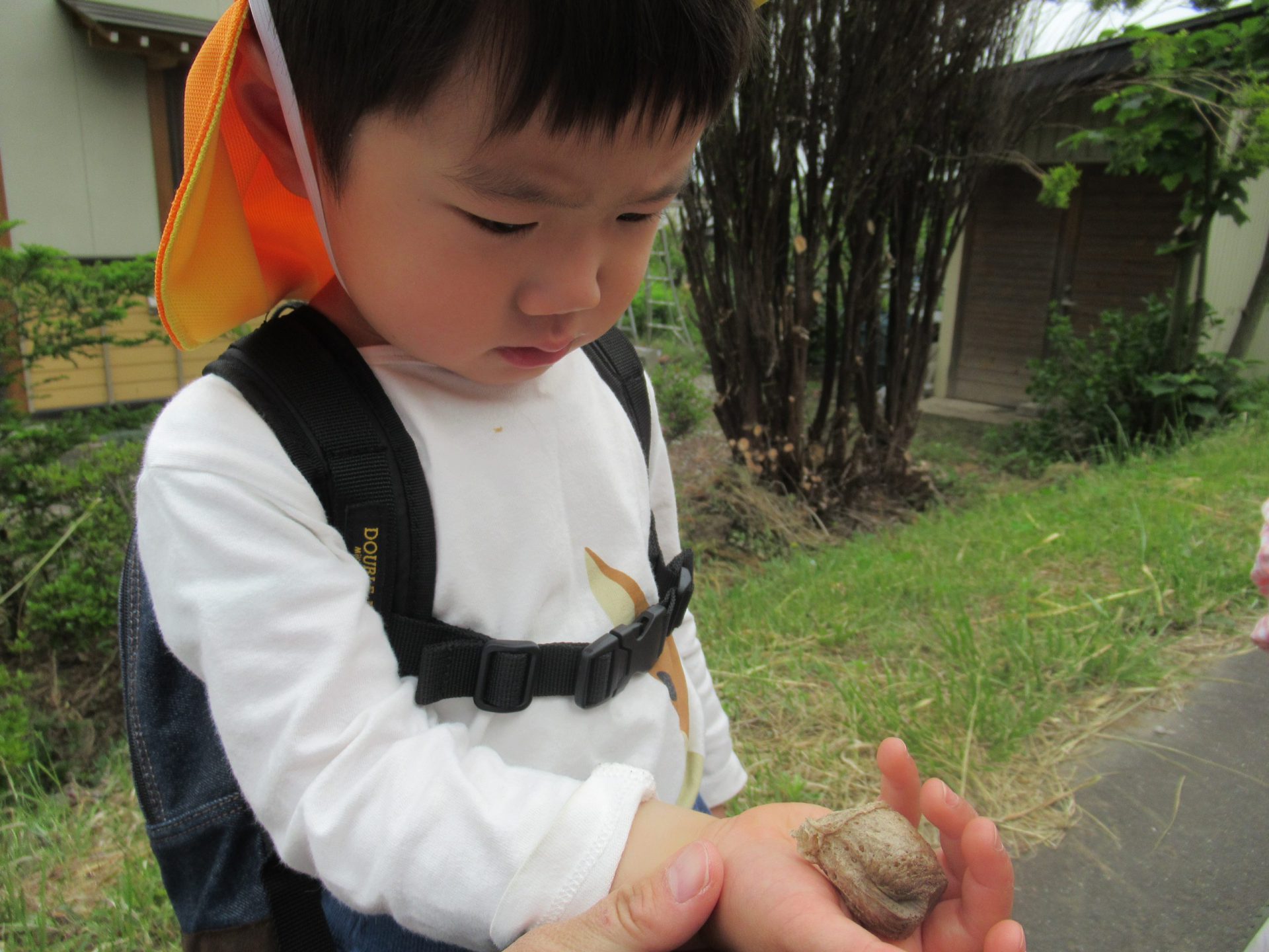 見ただけではどれのことかもよくわからず、不思議そうだったが手の上に乗せて近くで観察し保育士の助言でこれが”カマキリの卵”なんだと知ることができて感動していた。