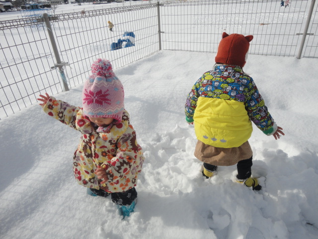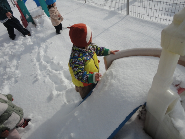 そこで、冬支度をして早速庭に出てみました。膝くらいまである雪の上を歩いたり、雪に触れ「つめたーい」と言いつつも足跡がつくことが面白くて色んな所を歩いてみたり、遊具に積もった雪を払って掃除(?)をする子など様々な反応でした。