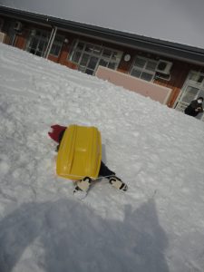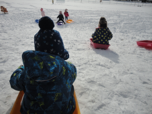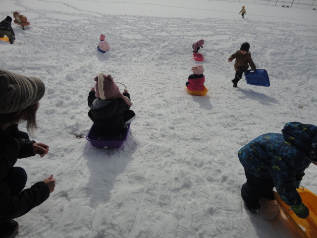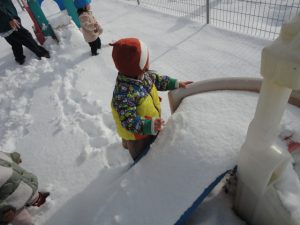 ・雪遊びでは、雪の冷たさに触れてビックリしていました。1歳児2歳児になると、ソリで雪の上を滑ったりなど雪を利用した遊びの楽しさに気付き繰り返し楽しめました。