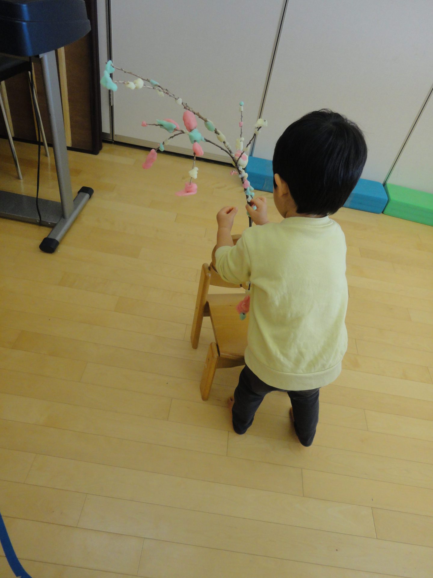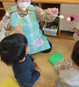 0・1歳児はできあがったまゆ玉に触れ、簡単な由来を聞いたりしました。