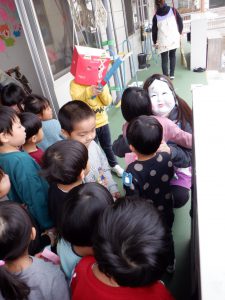 未満ちゃんのところへ行った鬼に後ろから豆をまき、助ける年長さん。