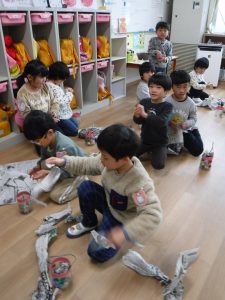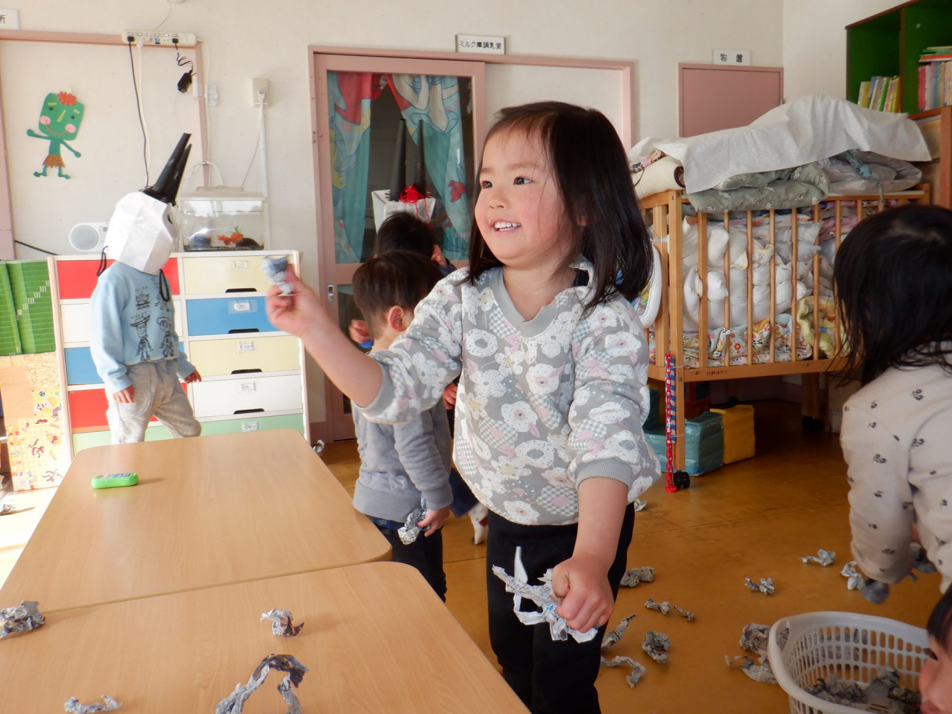 楽しく元気いっぱい新聞豆をまく年中さん。