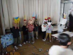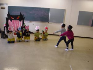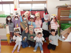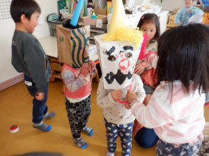 「節分の時きっと鬼が来るから、小さいお友だちがこわくないように、自分たちが鬼になって節分の練習をさせてあげよう」