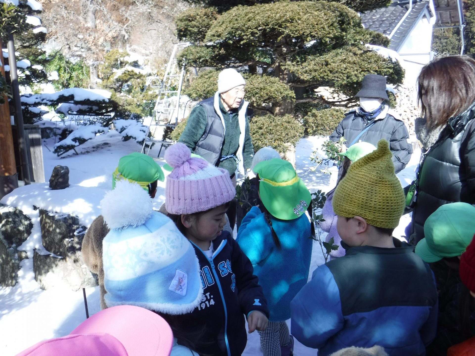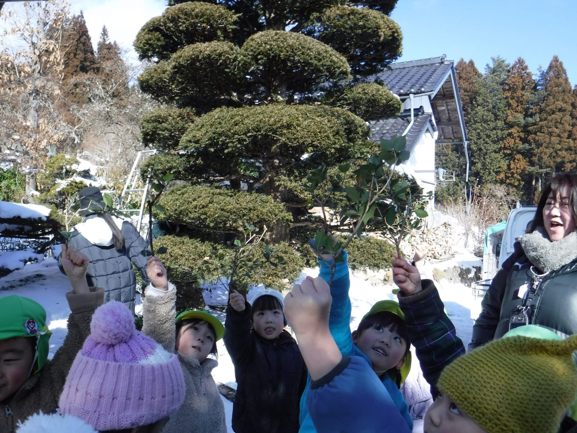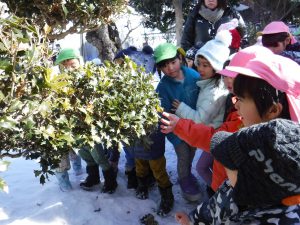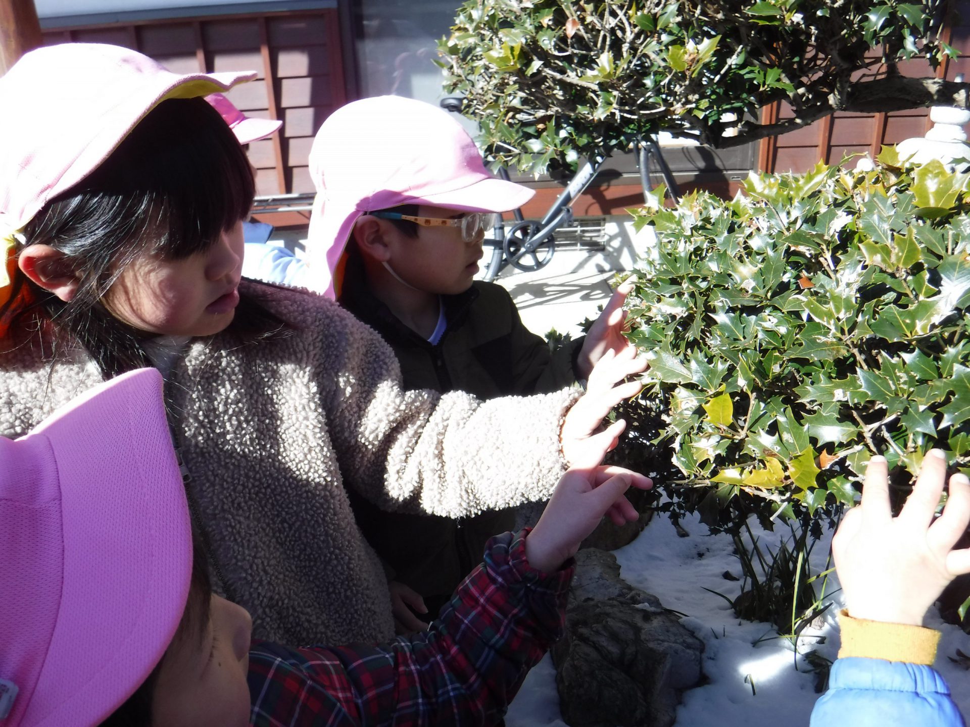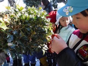 紙芝居で鬼の苦手なものは、豆といわしとひいらぎと知り、近くのお宅にひいらぎをもらいに行きました。