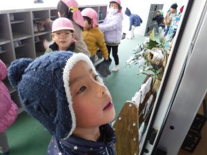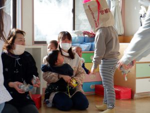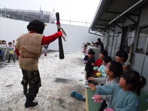 初めての年少さんも、ひとりも泣かずに力強く豆まきをしていました。