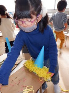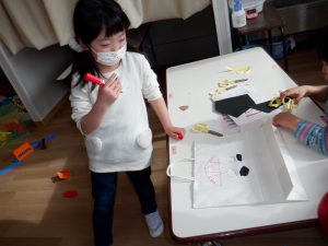「きりんさんみたいなお面作りたい」と紙袋のお面作りが始まりました。