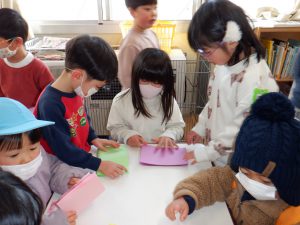 年長さんが豆を入れる枡の作り方を教えてくれました。